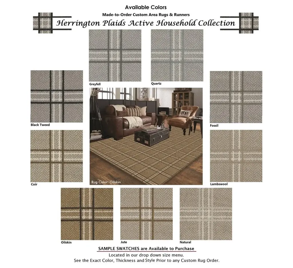 Milliken HERRINGTON PLAIDS Pattern Nylon Carpet Custom Made-to-Order Area Rugs | Excellent for ALL Indoor Applications - Exciting NEW Addition!RE: COLOR - Due to Monitor, Phone and iPad settings Ex: brightness settings, quality and pixels. Along with Flash Photography - COLORS you view with these devices may appear different than the actual finished product. (Images are as accurate as possible).SAMPLE SWATCHES are very effective and Help ELIMINATE RETURNSRecommended Prior to any Custom Made-to-Order Rug Purchase.See the exact color, thickness and quality of the carpet you will receive for your finished product.SAMPLES Swatches - Can be Purchased from most Listings (see the size drop down menu) If the Sample option is not available in the size menu. Please contact our customer service department to request yours today.CUSTOM RUG INFORMATION:Every HERRINGTON CUSTOM Rug is Made-to-Order upon receipt of purchase.CUSTOM PRODUCTION TIME: Average 2-3 weeks + Shipping DaysCarpet Origin: U.S.A.Due to pattern repeats on each design. Your area rug may not have the exact layout as shown in the picture provided. Each rug is custom and will vary based on size and shape.All edges are professionally Finished. Sewn and bound with a premium fabric tape to prevent fraying.Your HERRINGTON Carpet Area Rugs are made by Koeckritz Rugs, Inc. All Fabrication and Finishing of this area rugs is provided exclusively by Koeckritz Rugs. (Authorized Retailer). We do not wholesale.Quality is exactly what you will be getting when you purchase your new HERRINGTON CUSTOM Carpet Area Rug from Koeckritz Rugs.Koeckritz Rugs, Inc is Your #1 CHOICE for Carpet Area Rugs. With one of Largest selections of custom Sizes & Shapes along with hundreds of carpet styles, designs and colors under one roof. Our Custom Area Rugs, Runners, Mats and Dog Assist Stair Treads are DESIGNED to give you choices. From Every Day to LUXURY carpets, Indoor and Indoor/Outdoor, Level Loops, Berbers, Textured Cut Piles to the Shaggiest of Shags!!! .Quality materials, designer styles, patterns, thicknesses and colors to express your personal style! Along with providing unique interpretations for traditional or modern interiors. Something for every room in your Home. Our custom area rugs are unsurpassed in quality and style without sacrificing affordability.PRODUCT SPECS:Pattern Repeat Size of: 10.8"x10.8"br>Construction: Tufted, Pinpoint SAXONYFiber: 100% Invista TACTESSE Nylon.Maximum Thickness: 7/16". br>ANTI-STAIN Protection with Lotus FX Fiber Shield - Rug stays up to 30% cleaner and lasts up to 50% longer. Sheds Liquids, soil particles and food and beverage stains.ANTIMICROBIAL Built-IN Protection: AlphaSanCARE/MAINTENANCE: Vacuuming frequently with a good machine. Helps remove and prevent dry soils from building up to an unsightly level. Remove spills immediately by blotting and following your carpets recommended care and cleaning instructions.Over 40 years of carpet experience, Friendly and knowledgeable sales associates. Quality service and satisfaction guaranteed when you order from Koeckritz Rugs.SHIPPING: Due to standard shipping size Limits, most Large rugs will be folded to meet the shippers required dimensions. This may cause some minor creasing when you first receive your rug. Simply unfold and lay flat in your desired location and these creases will diminish in time.
