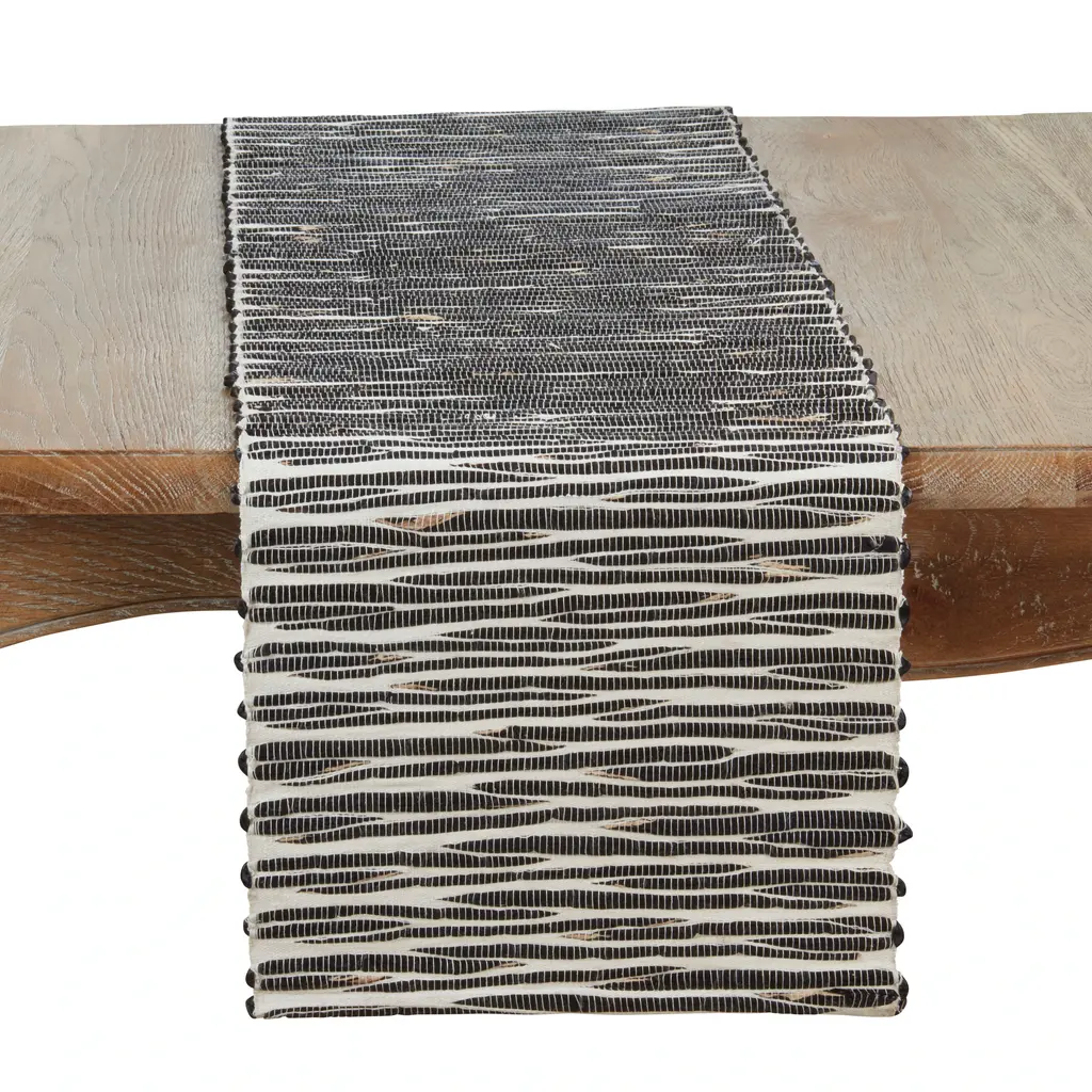 Preserving the great textile traditions of Oaxaca, artisan Mario Chavez crafts this versatile, neutral runner rug. The long runner is hand woven on a pedal loom in yarns of lead grey and ecru to produce a fine stripe with a grey border. Hand-knotted fringe accents both ends.