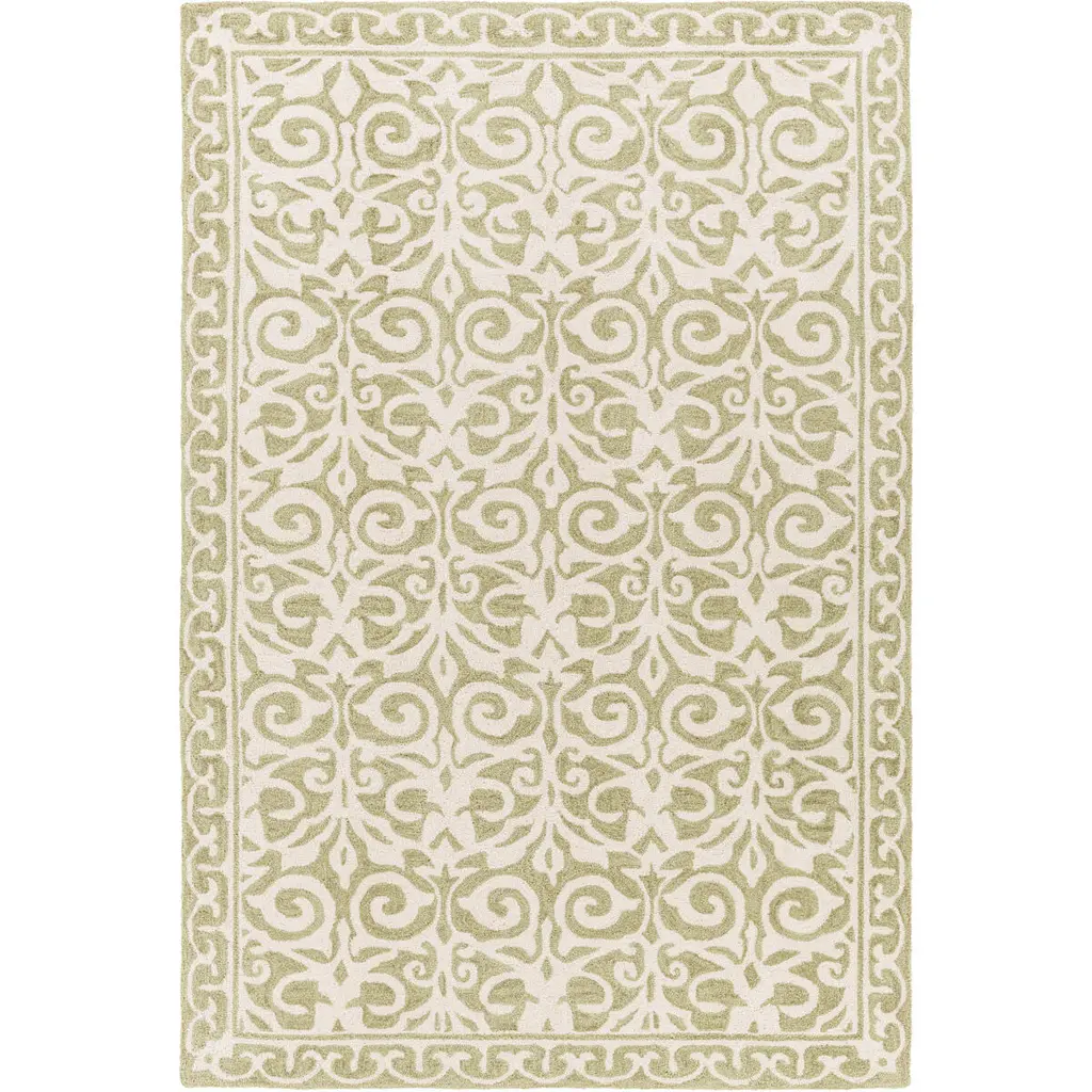 Collection: Hackett Colors: Olive, Peach Construction: Hand Tufted Material: 50% Viscose,50% Wool Pile: High Pile Pile Height: 0.63" Styles: Transitional Backing: Canvas Made In: India Thickness: 0.86" Price Range: $$$$$ (Affordable)