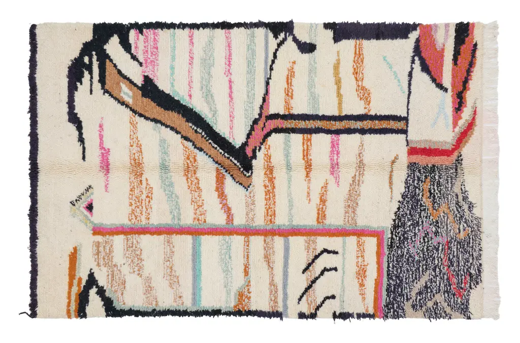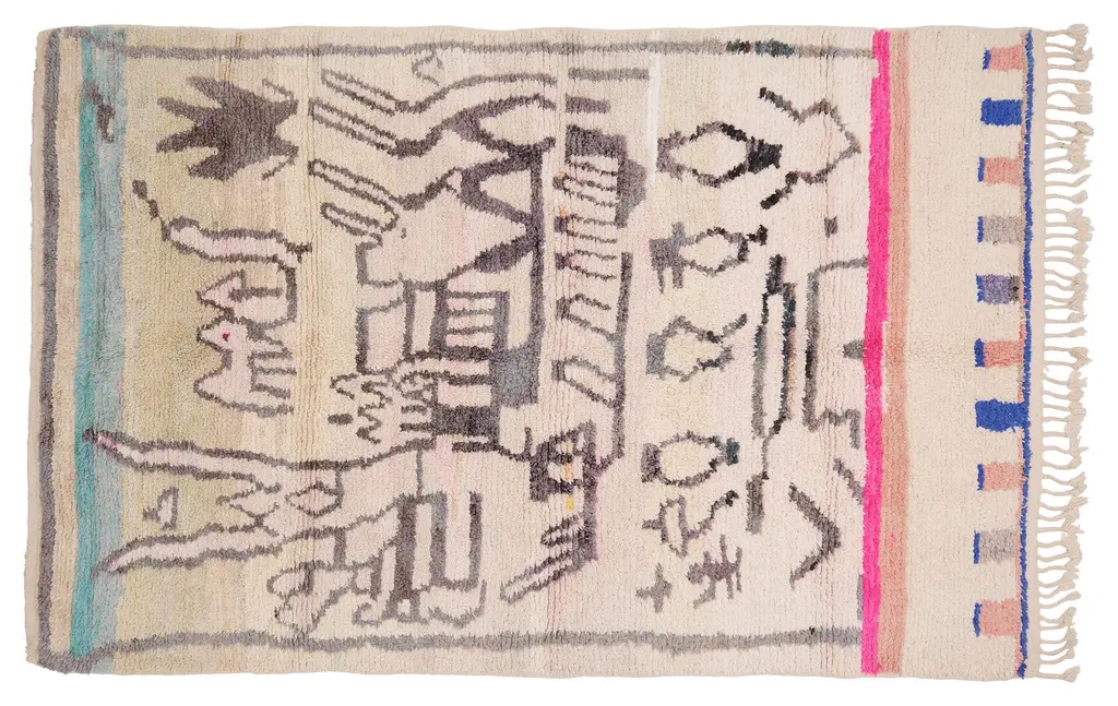 To celebrate the 30-year anniversary of her rug company, Nani Marquina commissioned a sketch by fellow designer Jaime Hayon, which was then carefully transformed into the striking Hayon X Nani Runner (2016). Hand-tufted from New Zealand wool, it's marked by what first appears to be nothing more than a tangle of random shapes and colors. Upon closer inspection, however, one recognizes all manner of objects - lips, hands, birds, fish, and more - cleverly hidden in the pattern. Made in India.