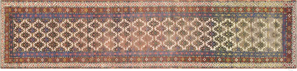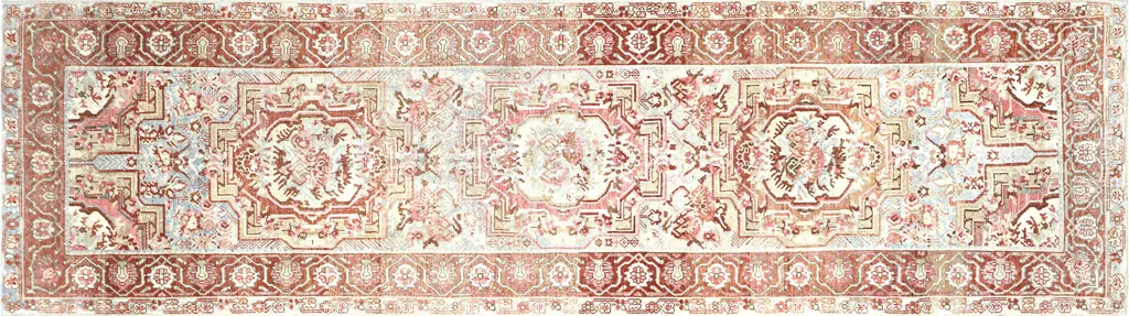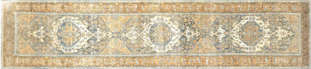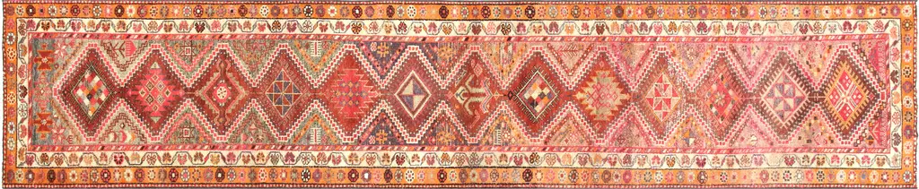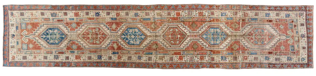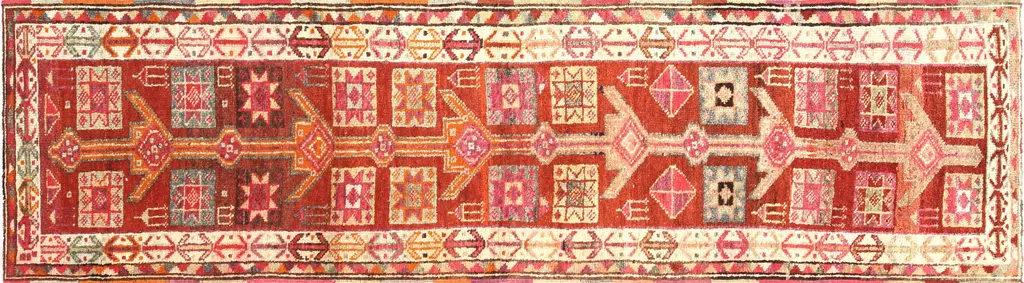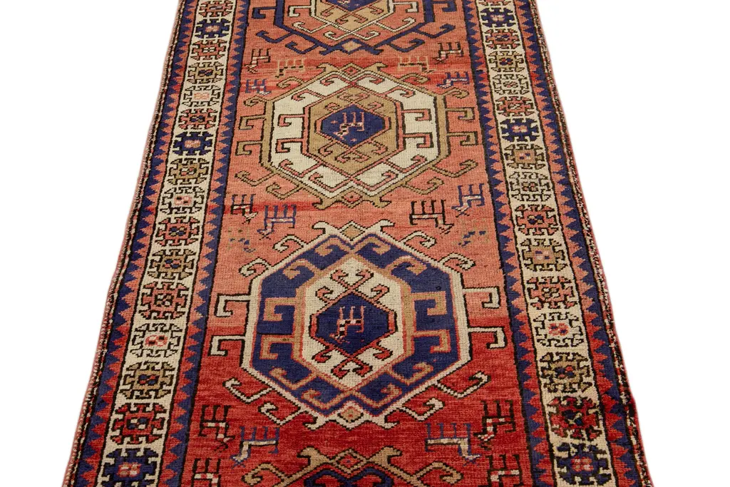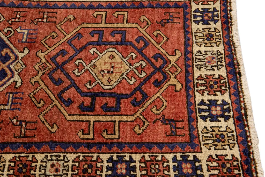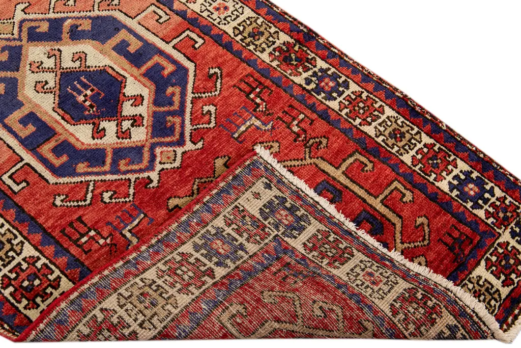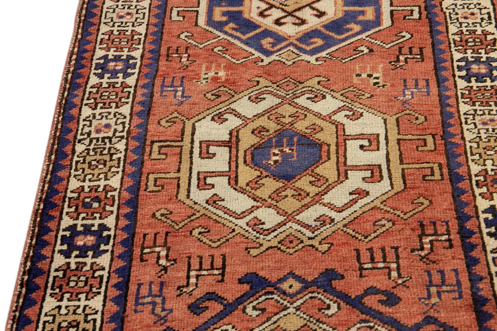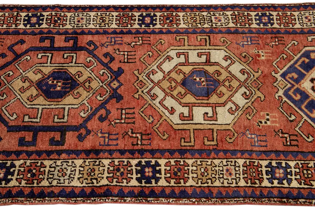 Beautiful Antique Heriz Handmade Wool rug with an all-over rust field. This piece has multicolor accents in a gorgeous all-over geometric medallion design. This rug measures: 2'10" x 12'5".