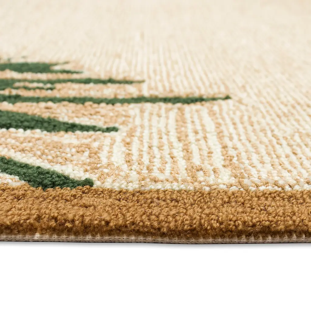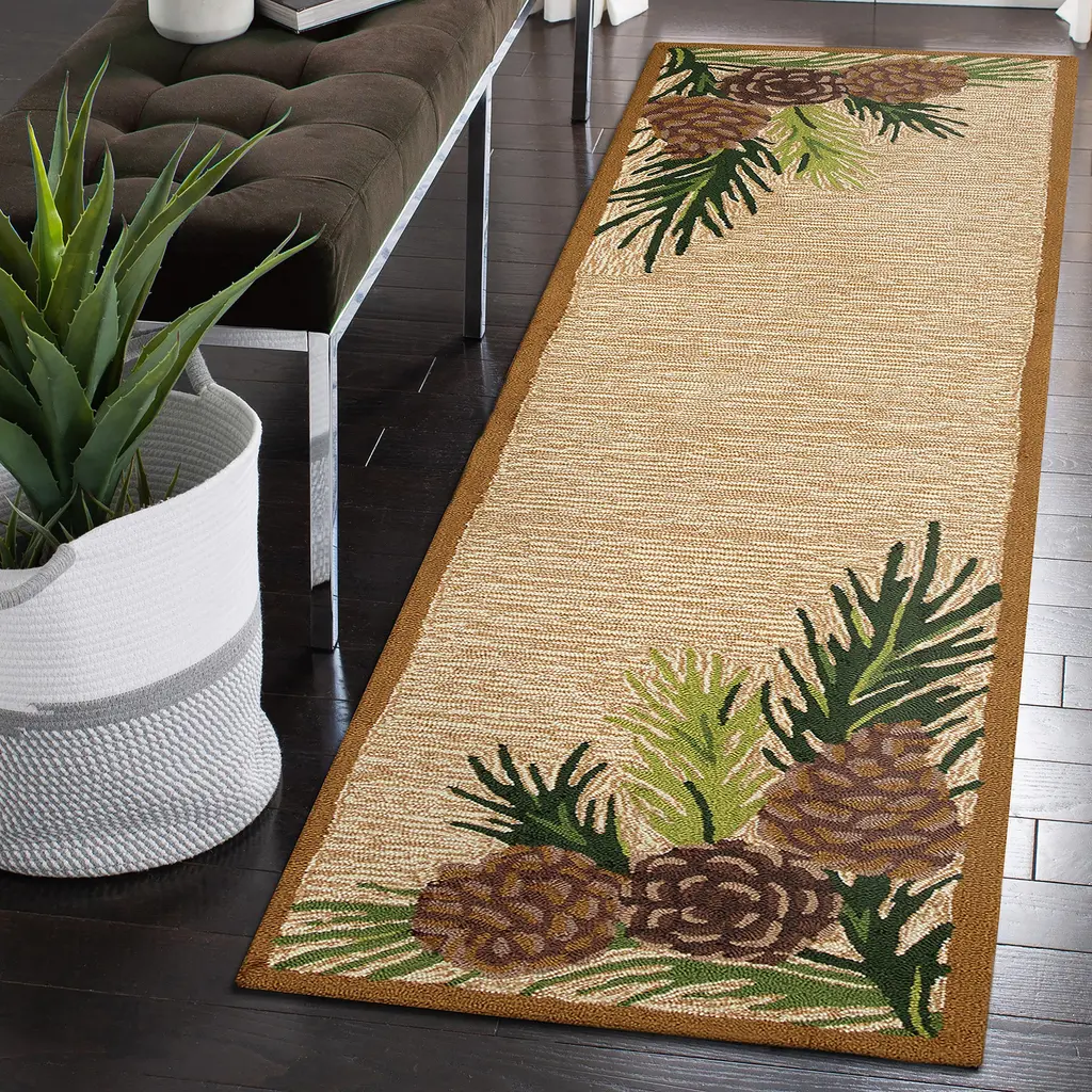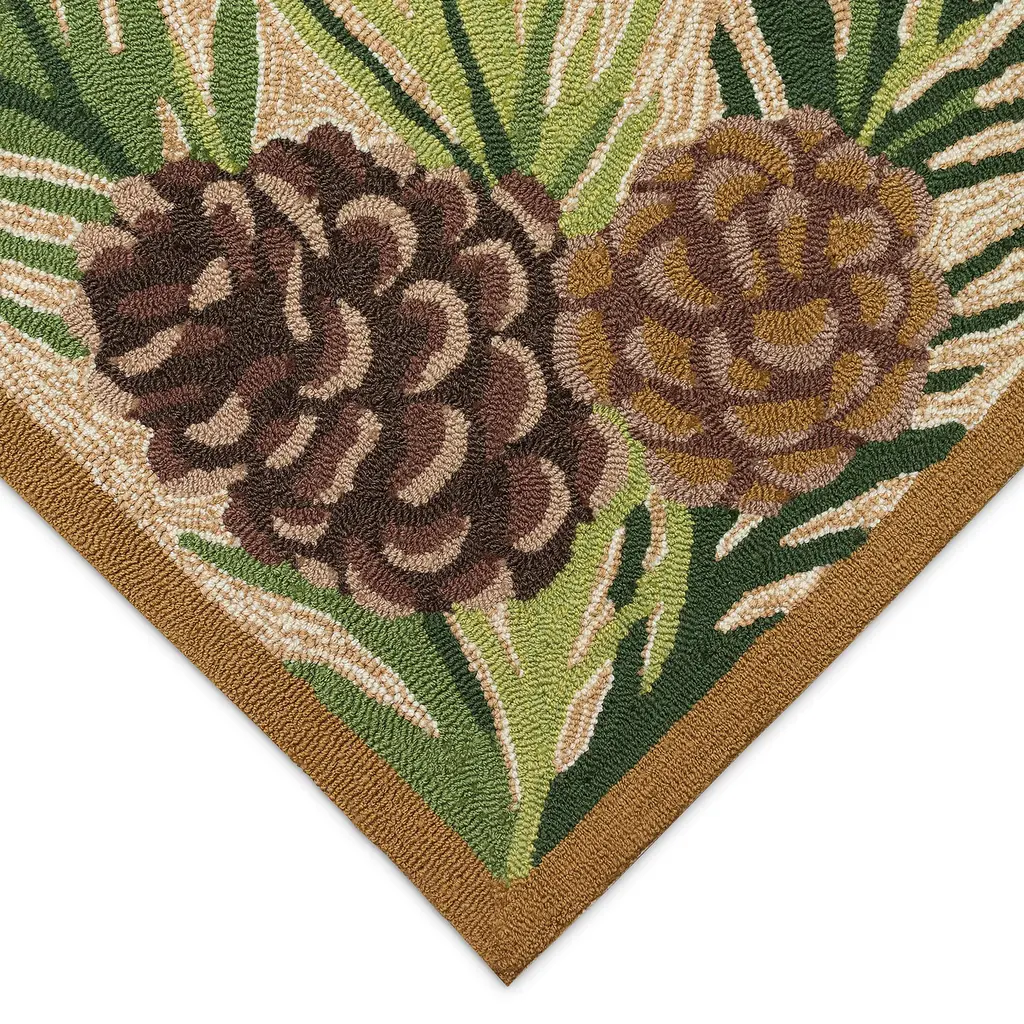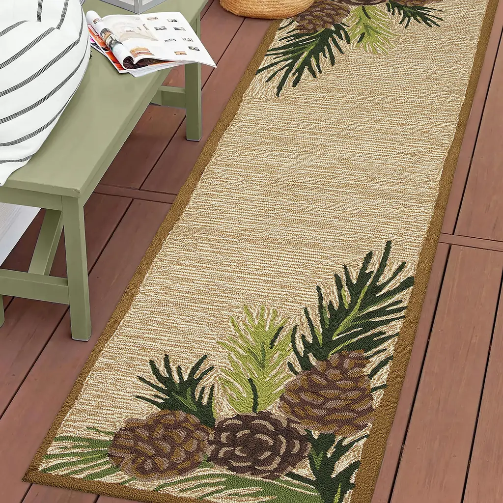 Our striking Indoor/Outdoor Forest Lake Border Rug brings natural style, rich color and superior durability to your home, for use indoors or outside. Featuring majestic pine cones in a hand-hooked style, this rug transforms any space into a rustic retreat. Rich, earthy tones and an eye-catching design bring woodland style to a family room, bedroom, den or cozy cabin with the durability to face the elements outdoors on a patio, porch, sunroom or deck. Perfect for casual or rustic decor, this rug is made from a polypropylene acrylic blend that is hand tufted to create vibrant multi-toned design that is highly detailed with tight textural finish. The material is flat-woven, weather-resistant and UV-treated for additional fade resistance. It's a soft rug perfect for all your high-traffic and family-friendly areas. Easy to care by hosing off with water. Imported