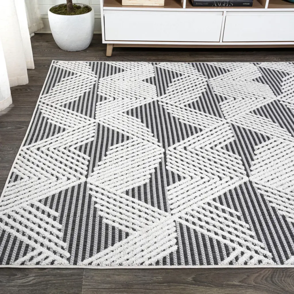 Inspired by Art Deco design, our jazzy geometric rug is power-loomed with a short pile. The all-over pattern is woven in a modern color palette. Add some graphic mid-century punch to your living room, dining room, entry, or bedroom with this easy-care rug. Features:• Power loomed with a 0. 31" pile that''s soft and durable• The deep gray and ivory color scheme is a modern take on neutral, graphic abstract rugs• Made from easy-care polypropylene - just sweep, vacuum or hose down with mild soap and water• 100% Polypropylene• No backing, use of rug pad is recommended (sold separately)• Power Loomed in Turkey• Actual Dimension: 2 ft. 2 in. X 10 ft. • Color: Black/Ivory• Thickness measures: 0. 31 in. • Available in multiple sizes and/or colorsRug Care:• Vacuum regularly and spot clean as needed; avoid direct and continuous exposure to sunlight; use brushless vacuum; remove spills immediately; if liquid, blot with clean, undyed cloth by pressing firmly around the spill to absorb as much as possible; for hard to remove stains, professional rug cleaning is recommended; store in a dry, well ventilated area and rotate for consistent wear• Packing and shipping may cause temporary creases in rugs, which will flatten out after a week on the floor; to expedite the process, try back-rolling your rug before laying it down, and then allow ample time for the remaining creases to relax• Please Note: Due to differences in monitors, some rug colors may vary slightly. Lengths and widths may vary from the published dimensions. Patterns may vary slightly according to shape and size selected. About us:Style your floors with JONATHAN Y. By combining fine craftsmanship and design, this New York creative studio is bringing fashion to your floors. The collection mixes sustainable organic materials, vibrant colors and trend worthy styles to create JONATHAN Y''s distinctive catalog of rugs.