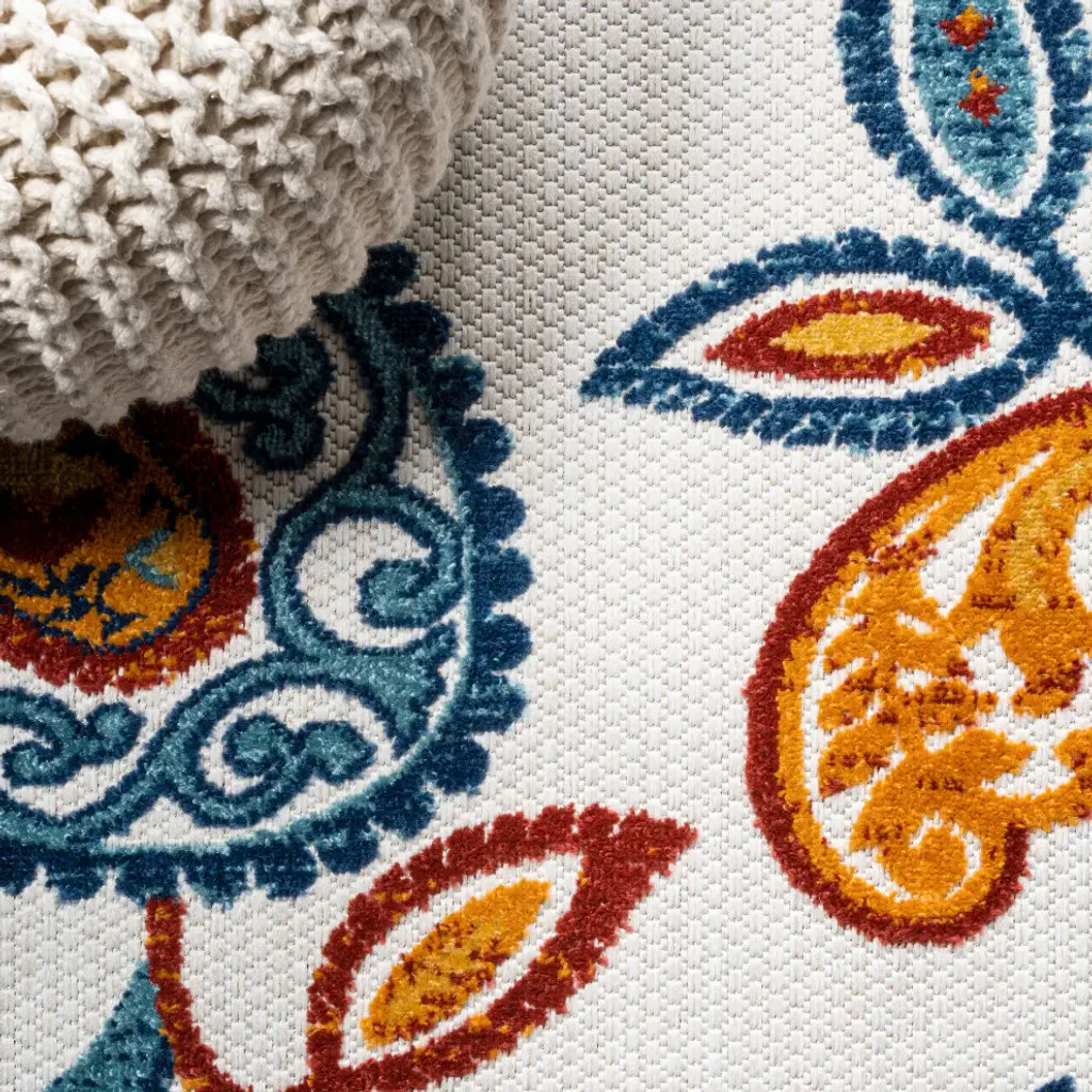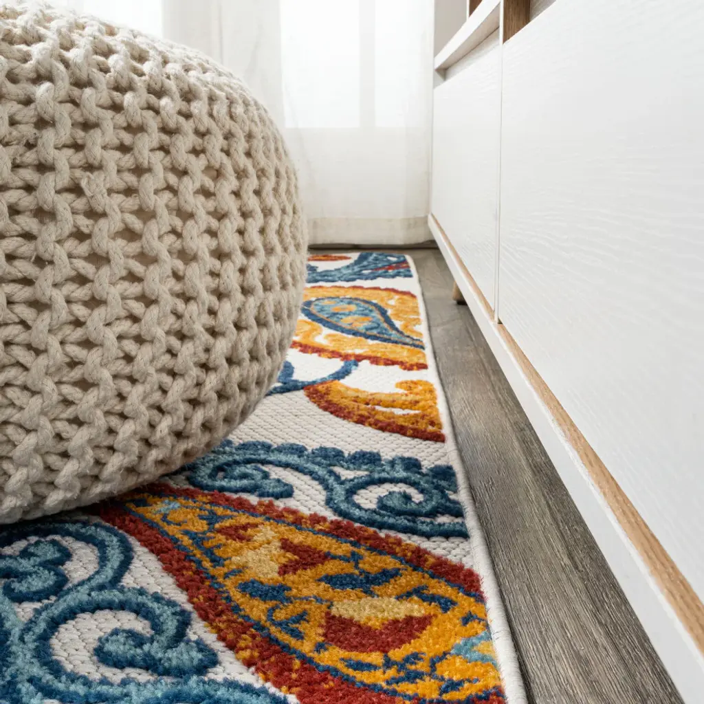 A Boho-inspired paisley pattern gives this indoor-outdoor rug a fresh look that''s ideal for a living room, family room, dining room, bedroom, or kids'' rooms. Soft, durable synthetic fibers are an easy maintenance solution for homes with kids and pets. Choose from several colorways and add a splash of style to your porch or patio. Features:• Power loomed with a high and low 0. 2" pile that''s soft and durable• Woven with coral, blue-green and yellow on a gray ground• Made from easy-care polypropylene - just sweep, vacuum or hose down with mild soap and water• 100% Polypropylene• No backing, use of rug pad is recommended (sold separately)• Power Loomed in Turkey• Actual Dimension: 2 ft. 3 in. x 8 ft. • Color: Orange/Blue• Thickness measures: 0. 2 in. • Available in multiple sizes and/or colorsRug Care:• Vacuum regularly and spot clean as needed; avoid direct and continuous exposure to sunlight; use brushless vacuum; remove spills immediately; if liquid, blot with clean, undyed cloth by pressing firmly around the spill to absorb as much as possible; for hard to remove stains, professional rug cleaning is recommended; store in a dry, well ventilated area and rotate for consistent wear• Packing and shipping may cause temporary creases in rugs, which will flatten out after a week on the floor; to expedite the process, try back-rolling your rug before laying it down, and then allow ample time for the remaining creases to relax• Please Note: Due to differences in monitors, some rug colors may vary slightly. Lengths and widths may vary from the published dimensions. Patterns may vary slightly according to shape and size selected. About us:Style your floors with JONATHAN Y. By combining fine craftsmanship and design, this New York creative studio is bringing fashion to your floors. The collection mixes sustainable organic materials, vibrant colors and trend worthy styles to create JONATHAN Y''s distinctive catalog of rugs.