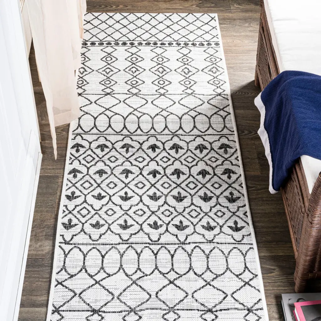Moroccan influences abound in the geometric design of our tribal-inspired rug. The ornate diamond pattern has the handwoven look that adds a global chic touch. Add Bohemian flair to your living room, dining room, bedroom, kitchen or entry with this easy-care rug.Features:• Power loomed with a 0.19" pile that''s soft and durable• The crisp blue and ivory color scheme adds coastal cottage flair to a modern tribal design• Made from easy-care polypropylene - just sweep, vacuum or hose down with mild soap and water• 100% Polypropylene• No backing, use of rug pad is recommended (sold separately)• Power Loomed in Turkey• Actual Dimension: 2 ft. 2 in. x 8 ft.• Color: Ivory/Black• Thickness measures: 0.19 in.• Available in multiple sizes and/or colorsRug Care:• Vacuum regularly and spot clean as needed; avoid direct and continuous exposure to sunlight; use brushless vacuum; remove spills immediately; if liquid, blot with clean, undyed cloth by pressing firmly around the spill to absorb as much as possible; for hard to remove stains, professional rug cleaning is recommended; store in a dry, well ventilated area and rotate for consistent wear• Packing and shipping may cause temporary creases in rugs, which will flatten out after a week on the floor; to expedite the process, try back-rolling your rug before laying it down, and then allow ample time for the remaining creases to relax• Please Note: Due to differences in monitors, some rug colors may vary slightly. Lengths and widths may vary from the published dimensions. Patterns may vary slightly according to shape and size selected.About us:Style your floors with JONATHAN Y. By combining fine craftsmanship and design, this New York creative studio is bringing fashion to your floors. The collection mixes sustainable organic materials, vibrant colors and trend worthy styles to create JONATHAN Y''s distinctive catalog of rugs.