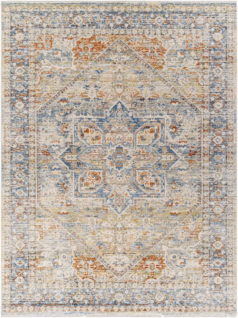 Collection: Kaia Colors: Blue, Orange, Ivory Construction: Machine Made Material: Face: Polypropylene, Viscose, Polyester / Warp: Cotton Pile: Low Pile Pile Height: 0.39" Styles: Transitional,Casual,Traditional Backing: Cotton Made In: Turkey Thickness: 0.39" Price Range: $$$$$ (Affordable)