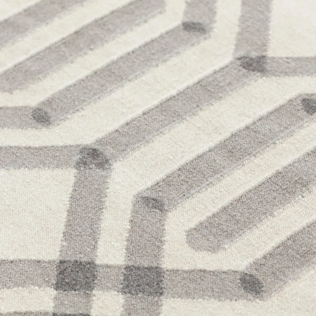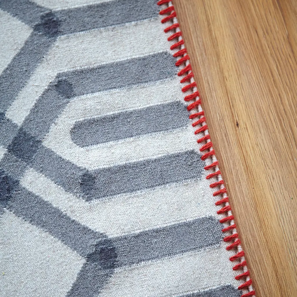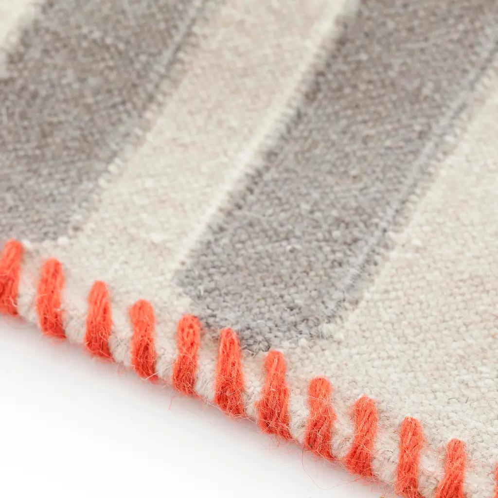 The Kilim Duna Rug draws from the quiet geometry of desert landscapes, where shifting sands create ever-changing patterns. Designed by Odosdesign, its repeating diamond motif is woven by hand using traditional kilim techniques, resulting in a flat, lightweight structure. Soft, neutral wool tones keep the design subtle, while a coral-hued stitch detail along two edges adds a touch of unexpected contrast. Versatile and reversible, this rug works effortlessly in a variety of spaces and is available in three sizes, including a runner and bedside format.