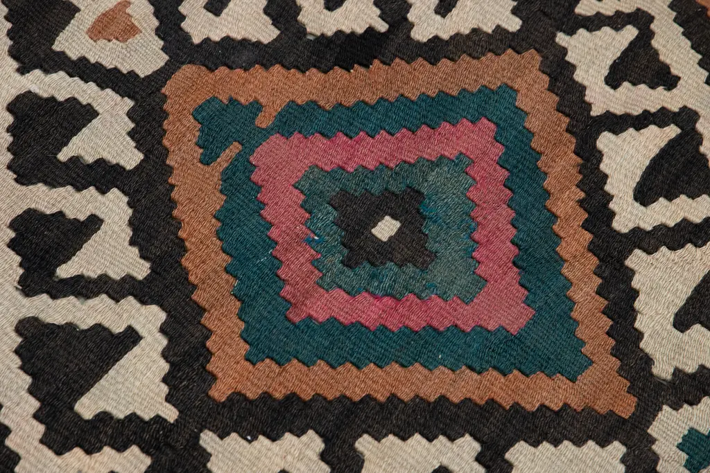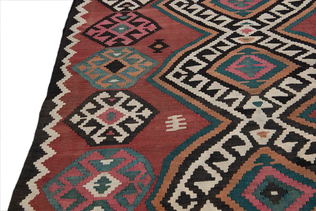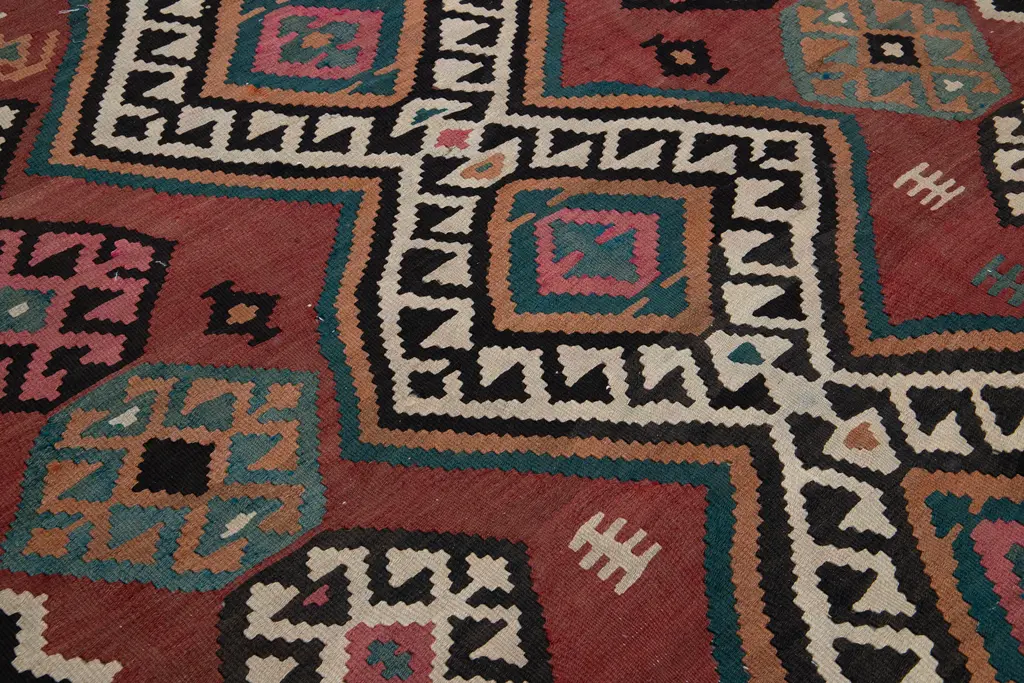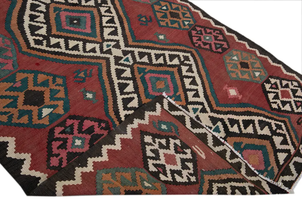 Beautiful kilim handmade wool runner with a burgundy red field. This Vintage flatweave rug has green, brown, and beige accents that feature a gorgeous all-over tribal design. This rug measures: 5'8" x 12'4"