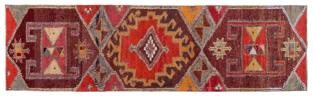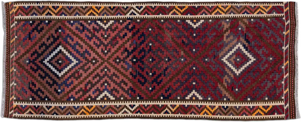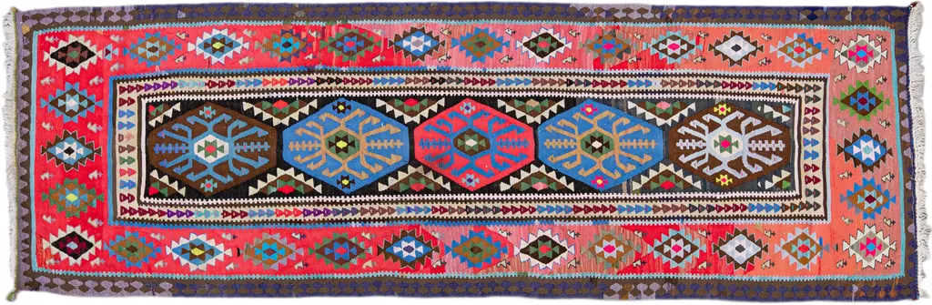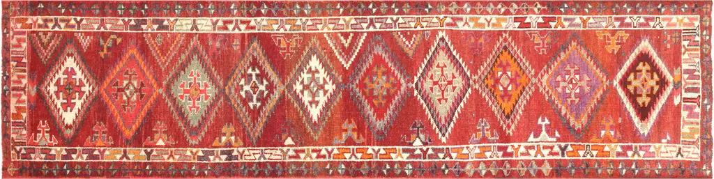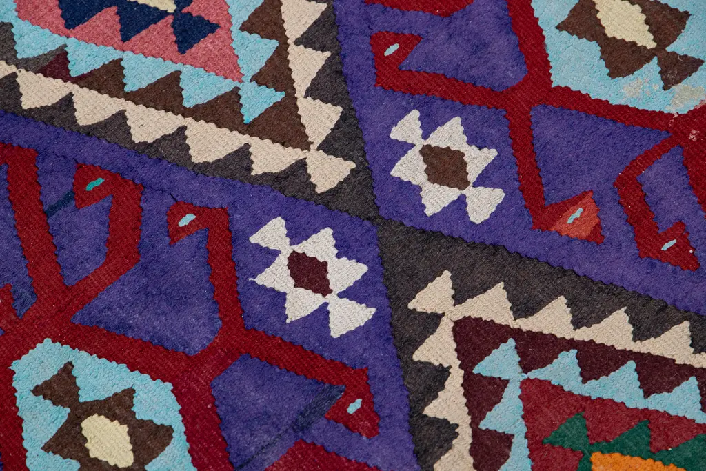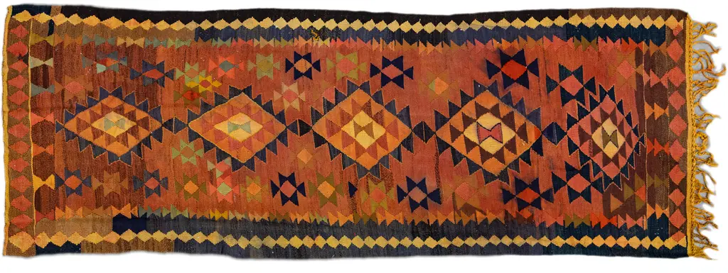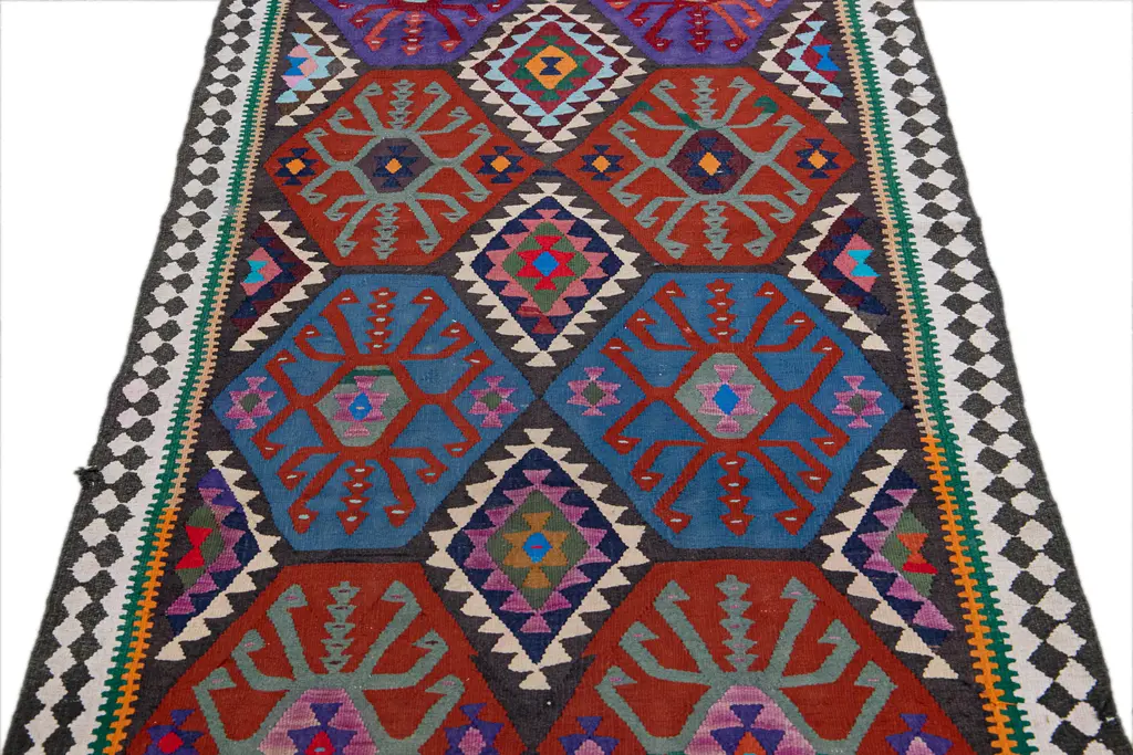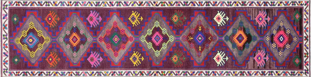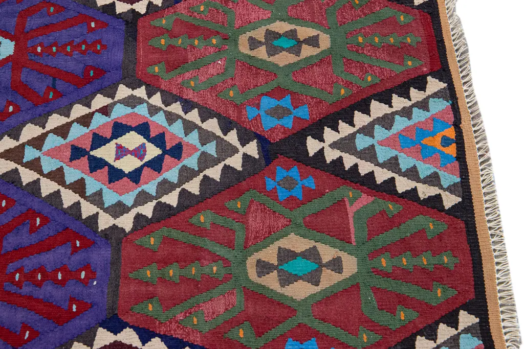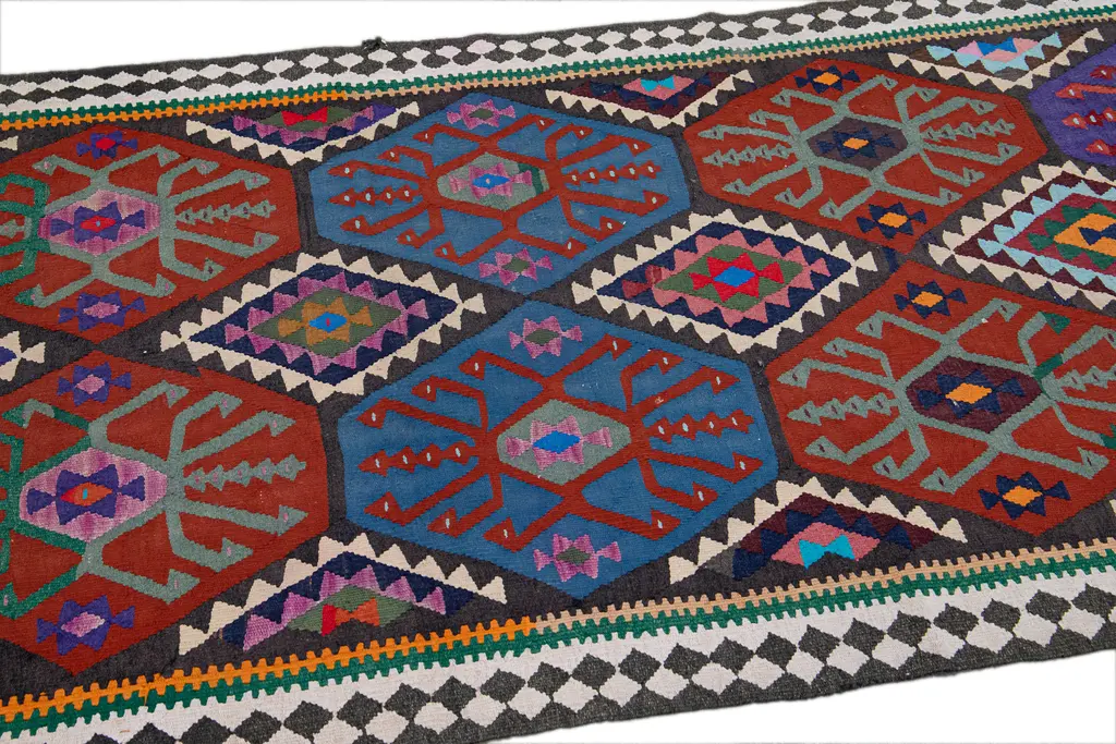 Beautiful kilim handmade wool runner with a multicolor field. This Vintage flatweave rug features a gorgeous all-over tribal design. This rug measures: 3'4" x 9'4"