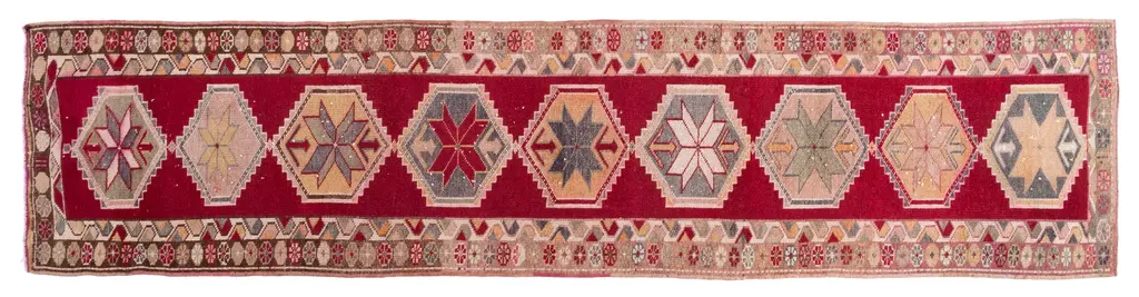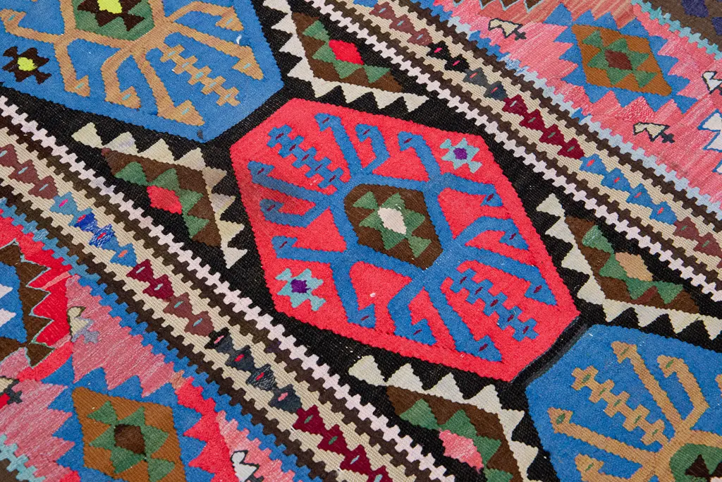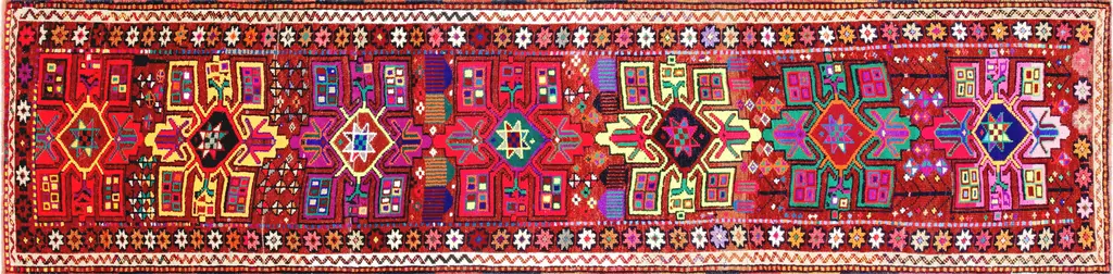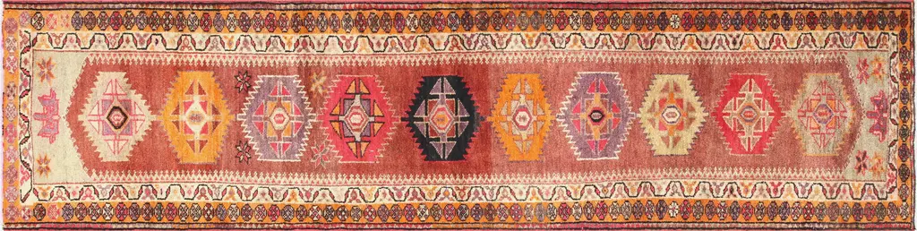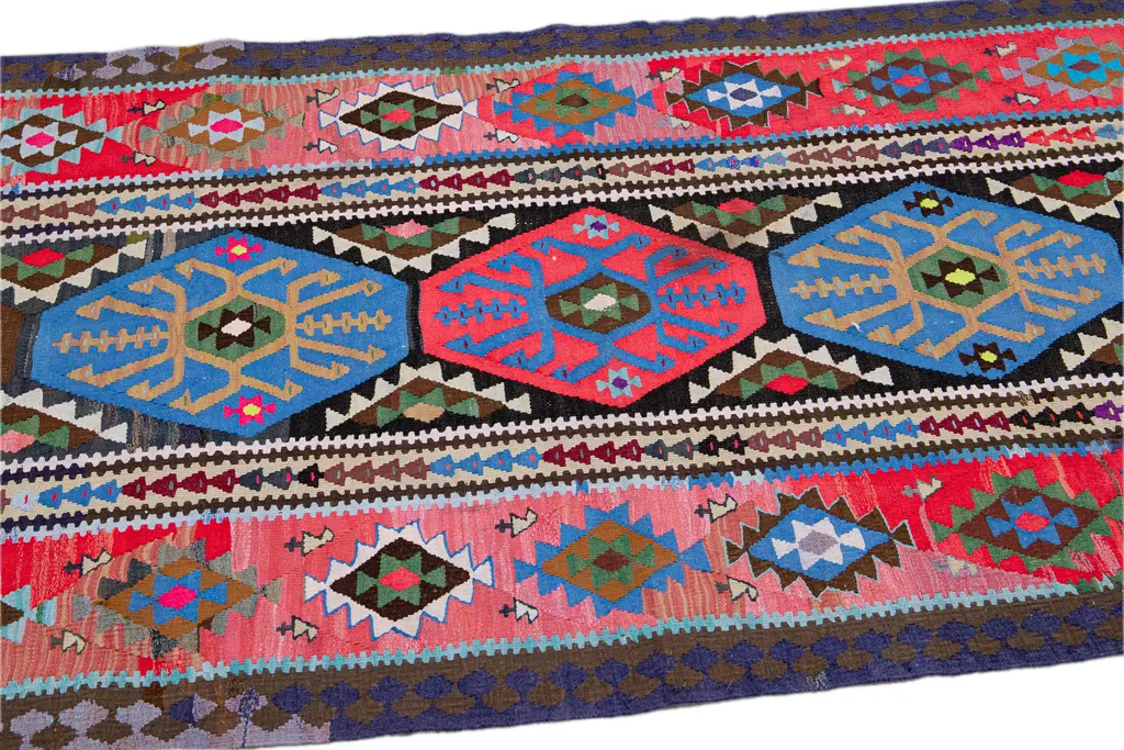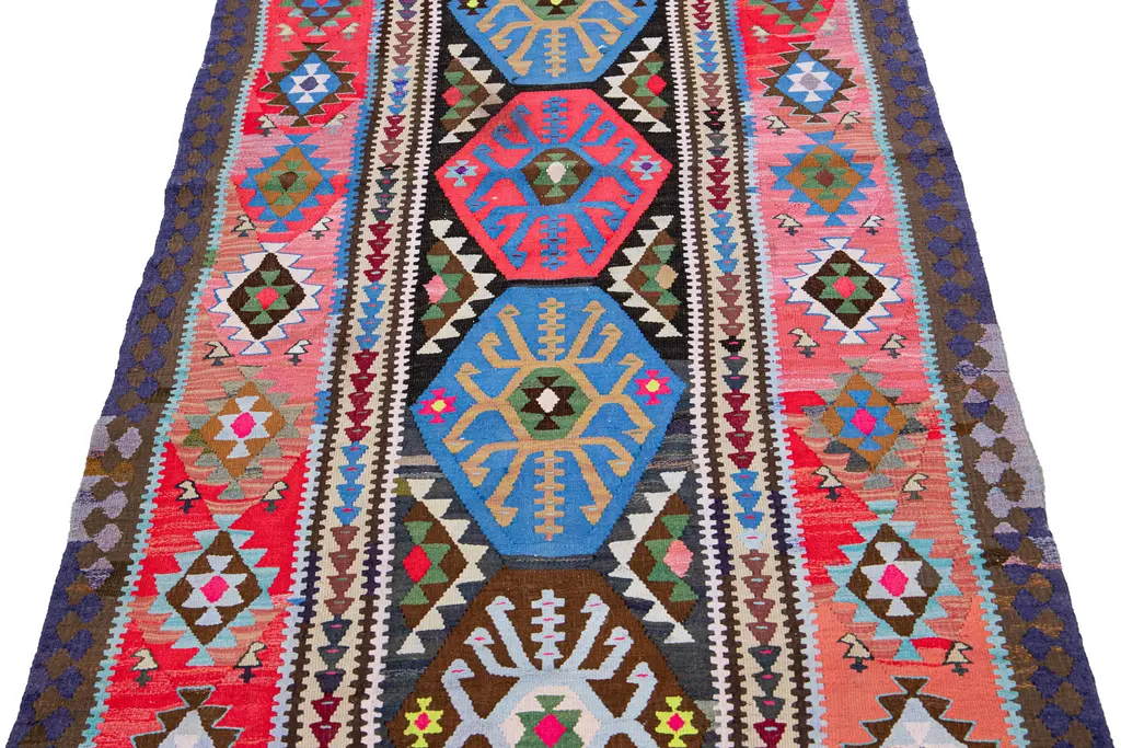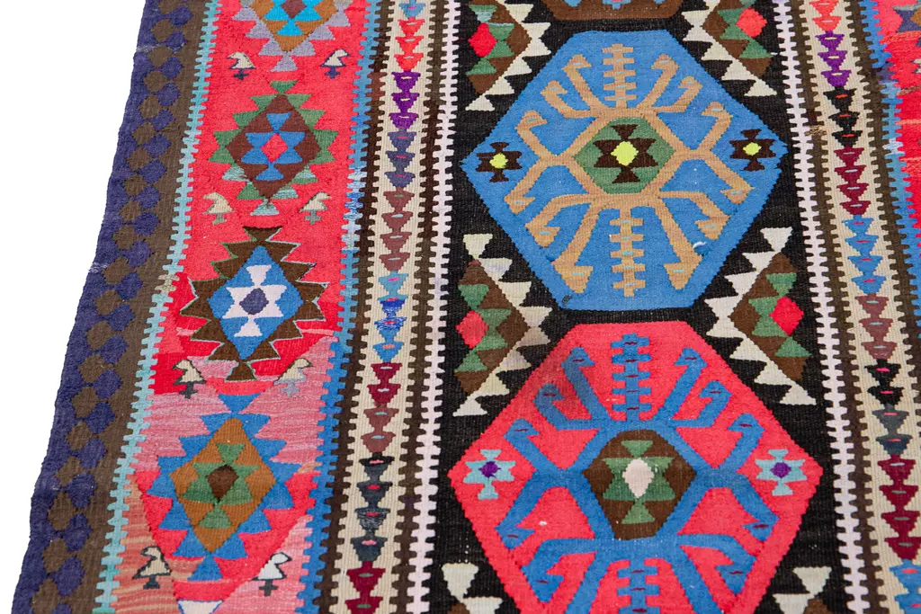 Beautiful kilim handmade wool runner with a brown field. This Vintage flatweave rug has multicolor accents features a gorgeous all-over tribal design. This rug measures: 3'2" x 9'10".