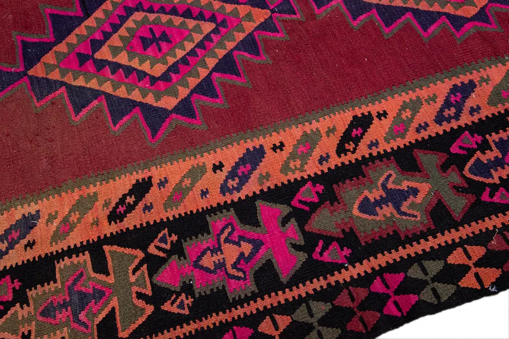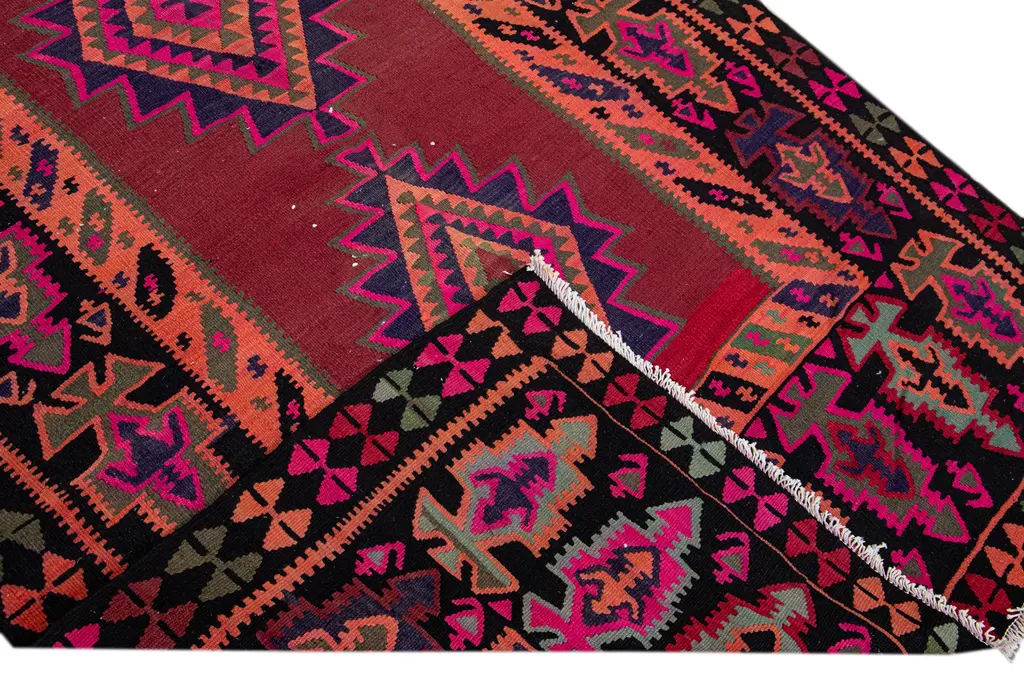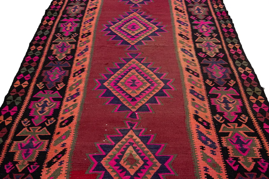 Beautiful kilim handmade wool runner with a red field. This Vintage flatweave rug has pink, black, and brown accents feature a gorgeous all-over tribal design. This rug measures: 5'1" x 12'6".