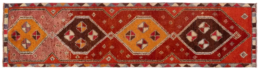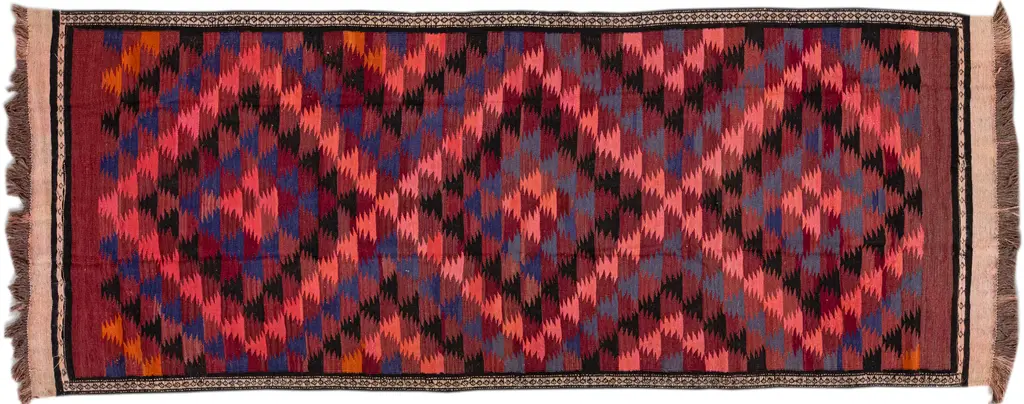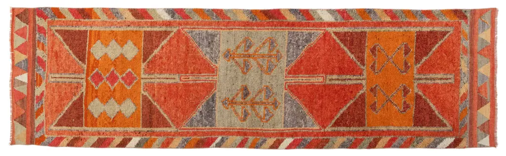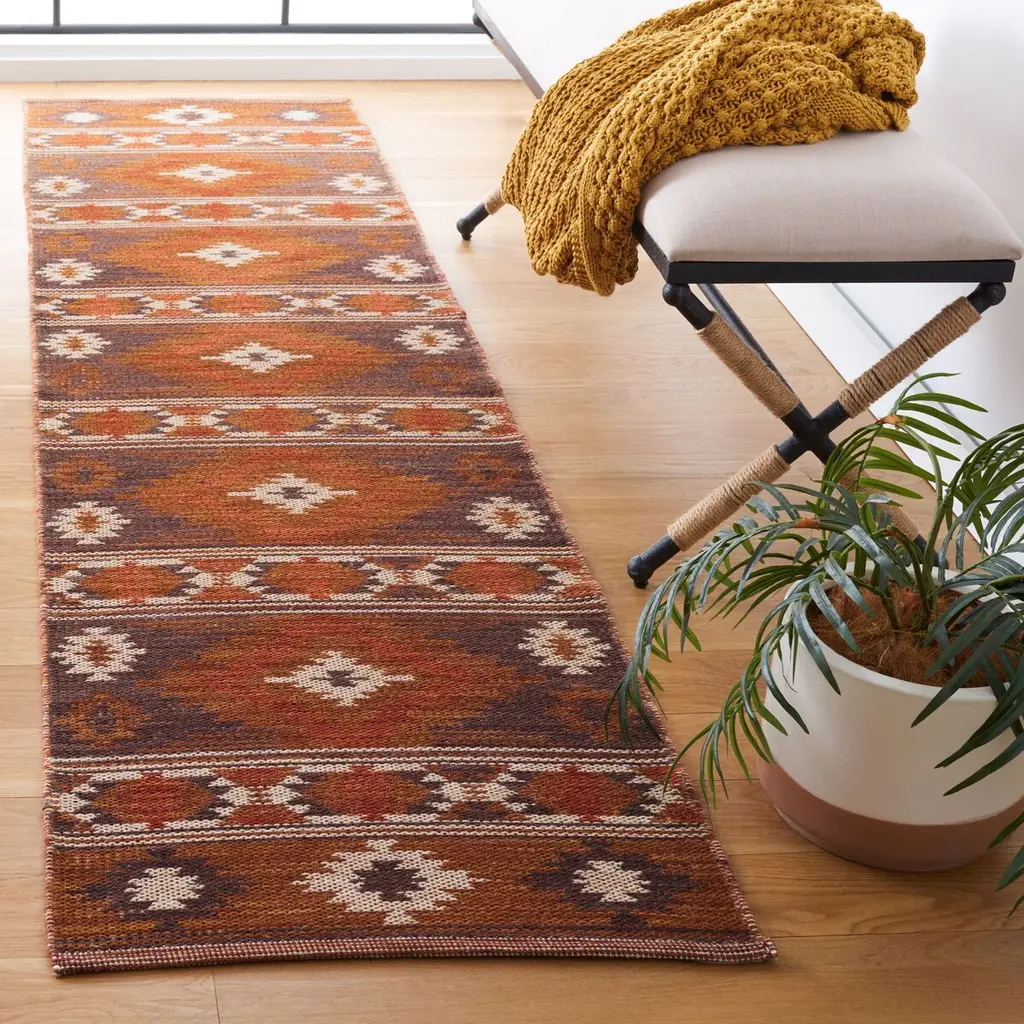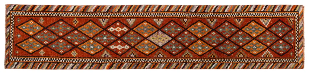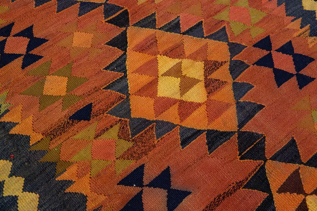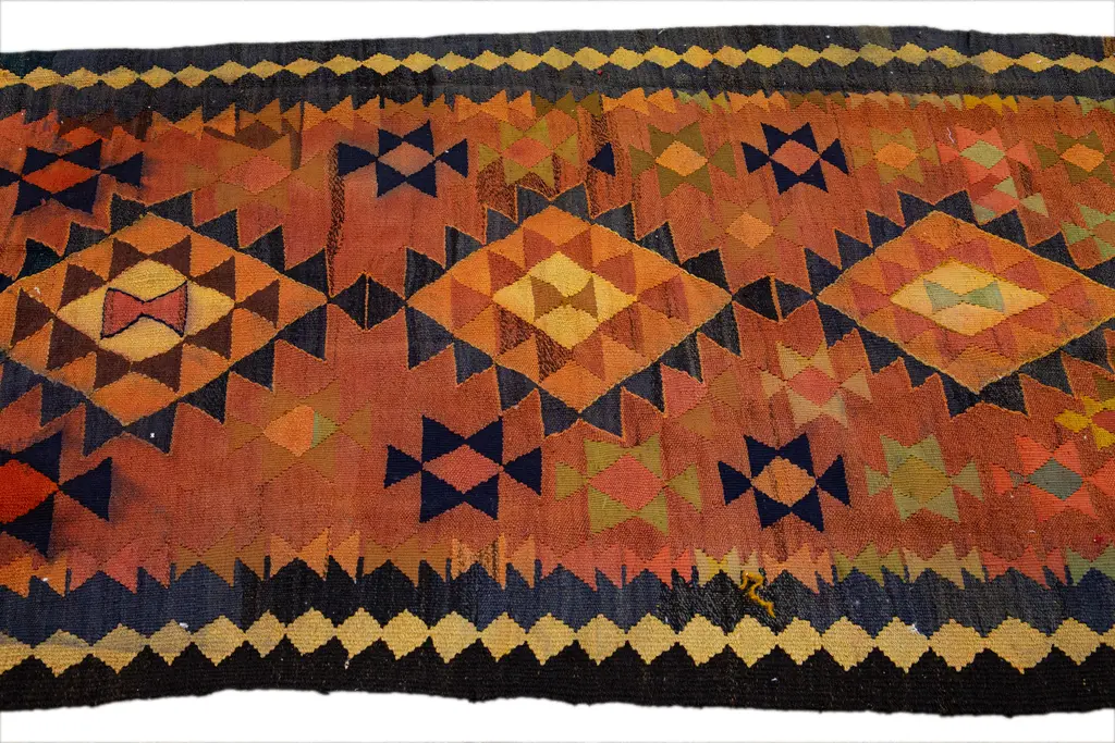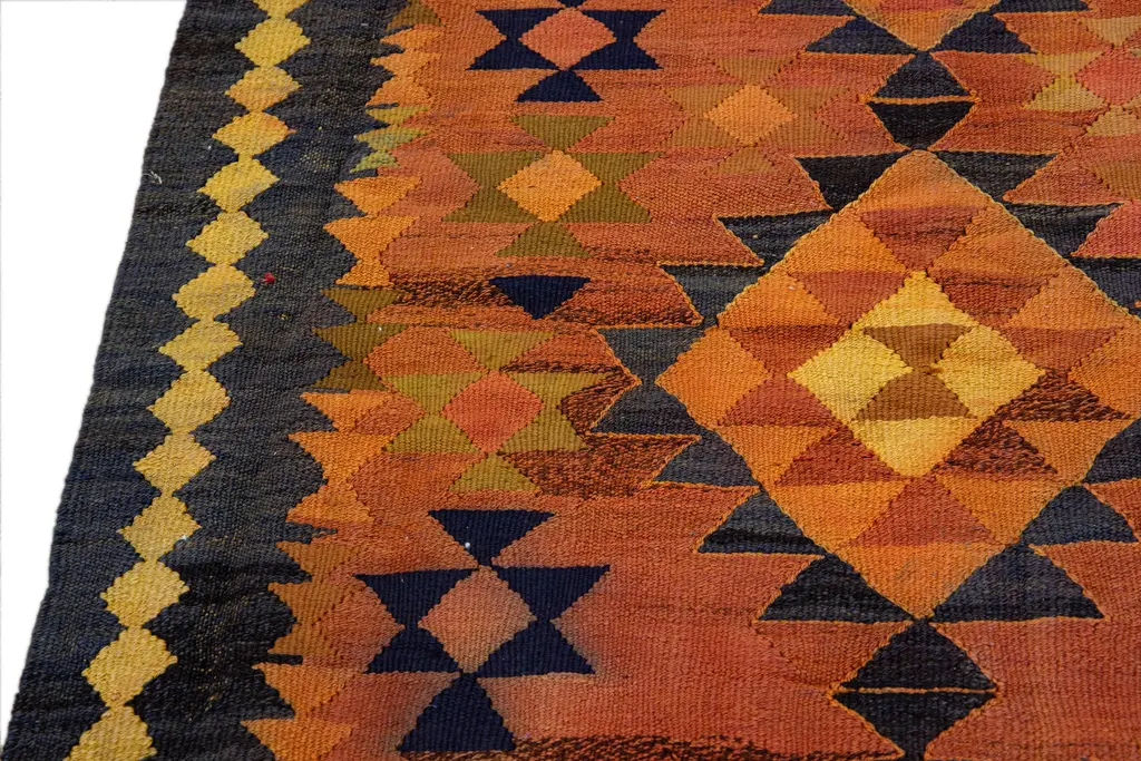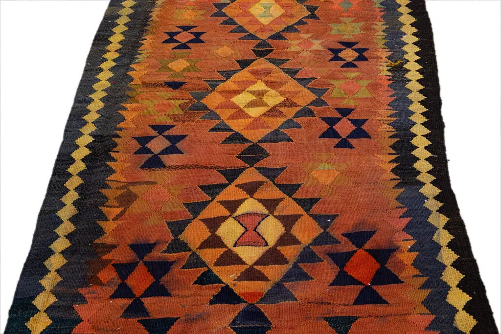 Beautiful kilim handmade wool runner with a rust field. This Vintage flatweave rug has brown, orange, and goldenrod accents that feature a gorgeous all-over tribal design. This rug measures: 3'7" x 10'1".