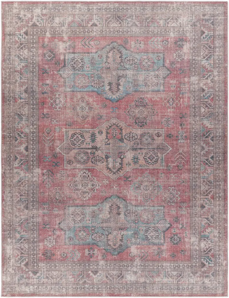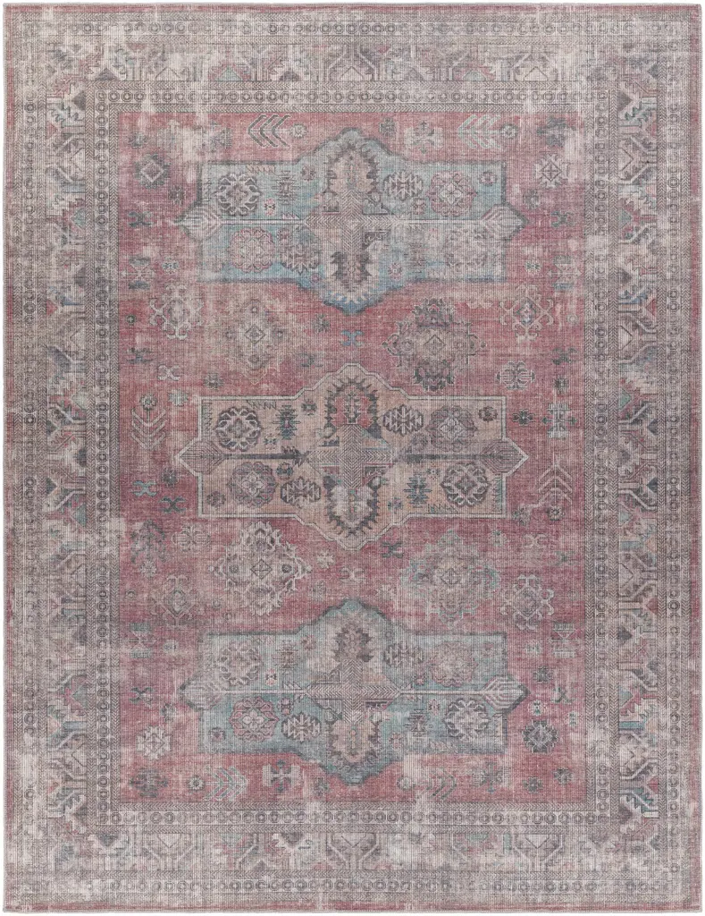Collection: Konak Colors: Aqua, Charcoal, Light Brown, Red, Taupe Construction: Machine Woven Material: 60% Chenille-Polyester,40% Jute Pile: Low Pile Pile Height: 0.02" Styles: Traditional Backing: Canvas Machine Washable: Yes Made In: Turkey Thickness: 0.2" Price Range: $$$$$ (Most Affordable)