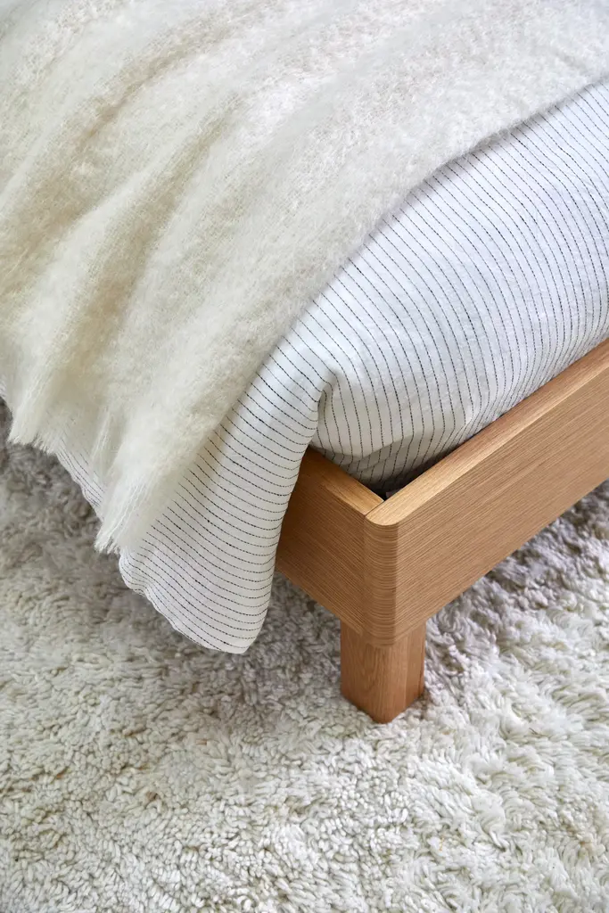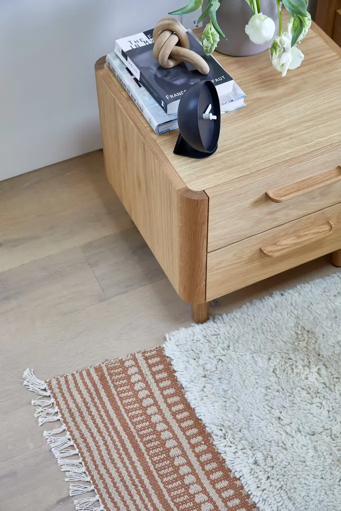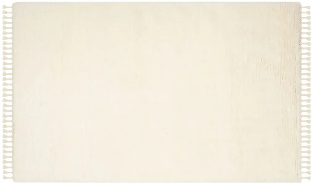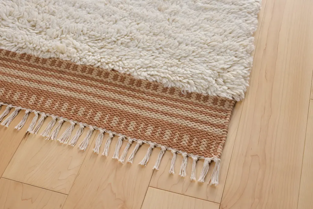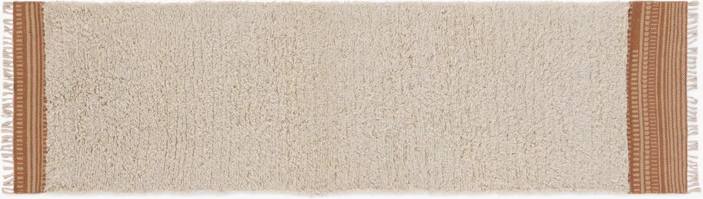 The Kufi Shag Rug (2023), part of the DWR Rug Collection, features a luxurious high pile and wonderfully lush texture. Woven by hand on a horizontal manual loom, it is finished with a flatwoven, kilim border and fringe on both ends. It feels incredibly soft and cozy underfoot. Made in India.