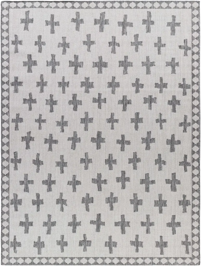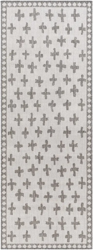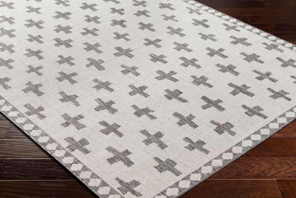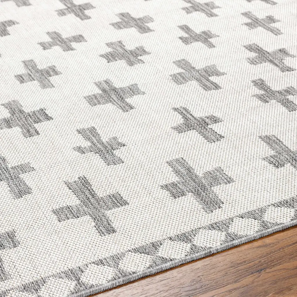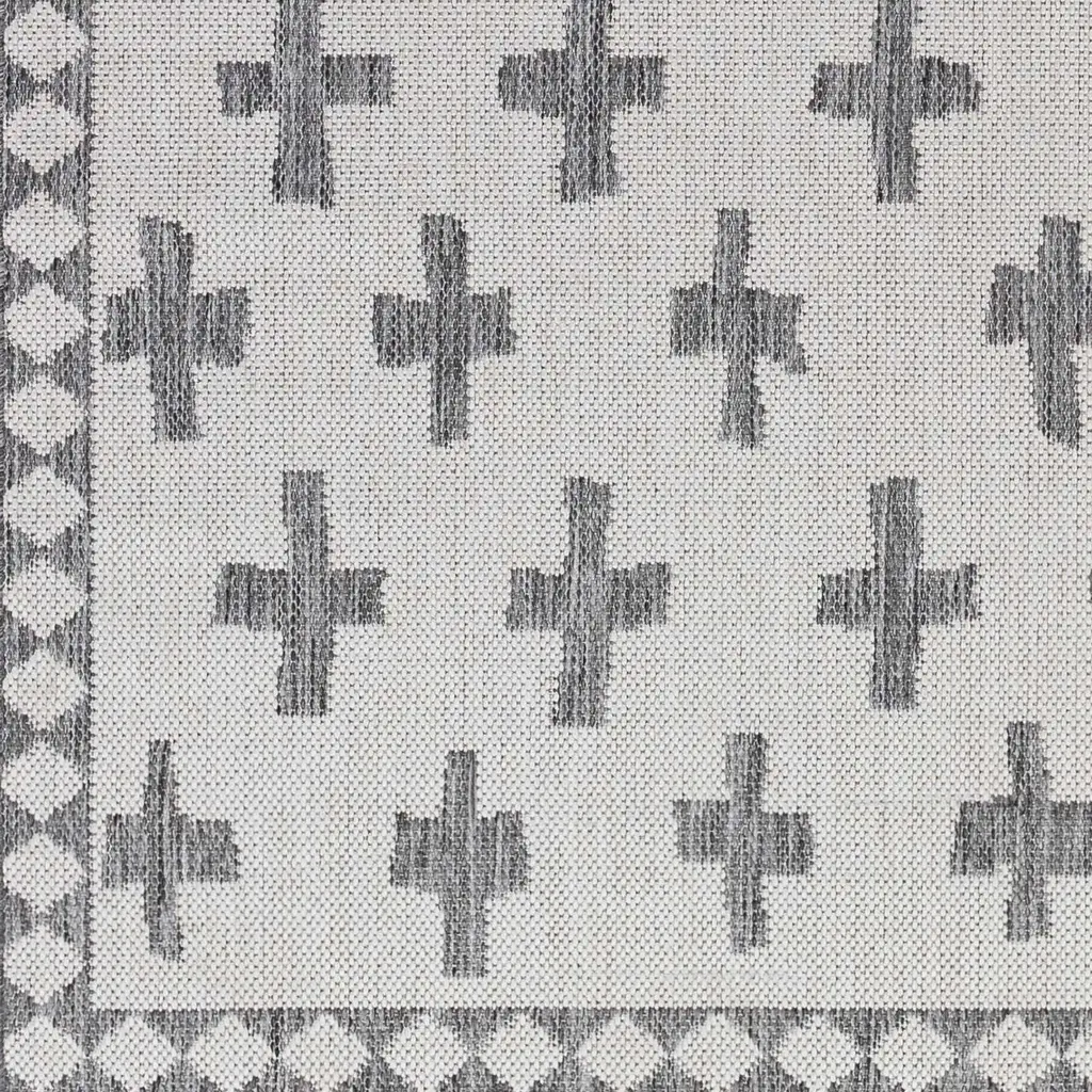 Collection: Kyna Colors: Off White, Charcoal, Medium Gray Construction: Machine Woven Material: 100% Polypropylene Pile: No Pile Styles: Transitional,Bohemian Outdoor Safe: Yes Made In: Turkey Thickness: 0.2" Price Range: $$$$$ (Most Affordable)