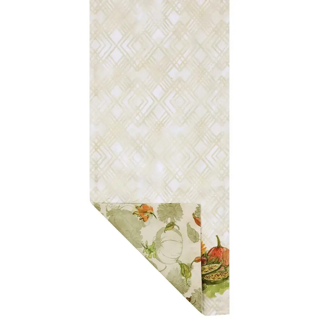 This colorful seasonal "Cornucopia Harvest" design comes to life to form the perfect fall reversible runner. This runner features an abundant cornucopia filled with pumpkins, gourds, and corn. In the center is a wreath of sunflowers and other fall delights. The autumnal colors of yellow, orange, and green shine on the diamond trellis background. "Cornucopia Harvest" placemat will add a festive thanksgiving flair to your dining room.