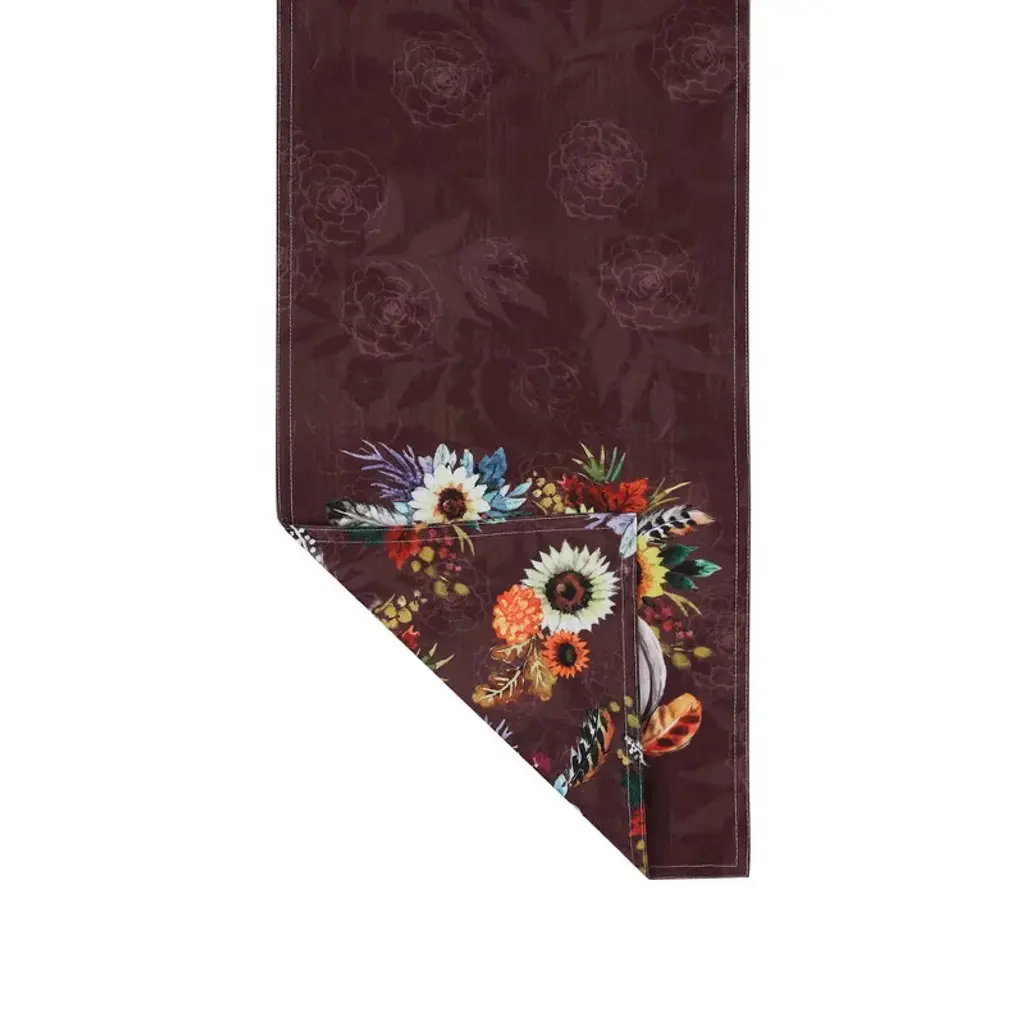 "Fall Feathers" reversible runner features vibrant jewel-toned watercolor flowers, sunflowers, pumpkins, and fun feathers. Positioned in the center of the runner are three elegant wreaths. The background contrasts the bright colors with a rich maroon-colored decorative pattern of line art flowers and floral silhouettes. Our "Fall Feathers" reversible placemat will add a fresh fall flair to your home.