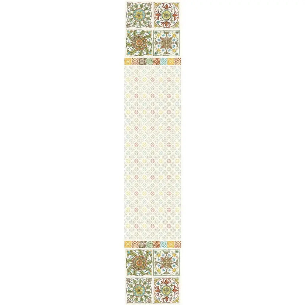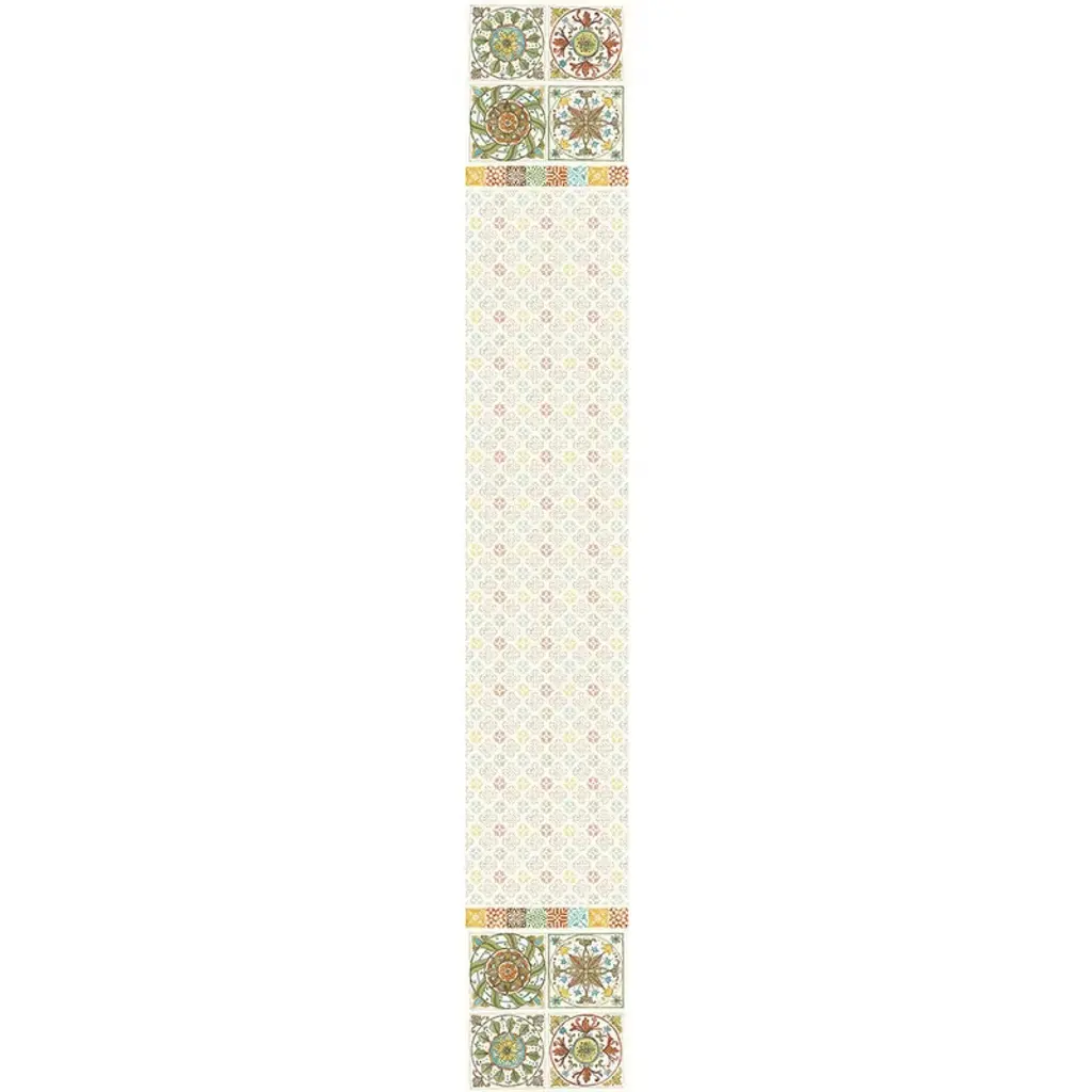 This Moroccan style inspired runner, Under the Golden Sun" features unique, multicolored patterns and tiles. The painted watercolor accents create a colorful and fun dining decor for your home. Add this beautiful, soft to the touch runner to spice up your dining space!