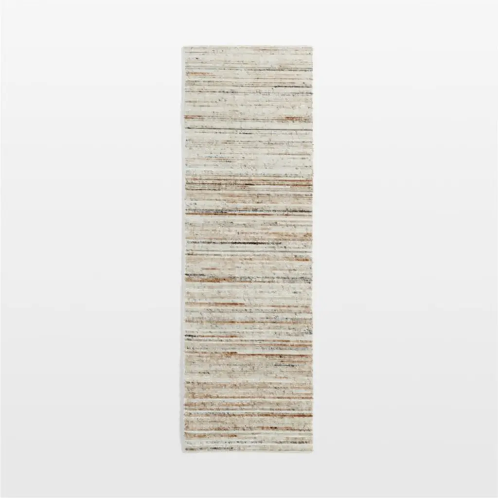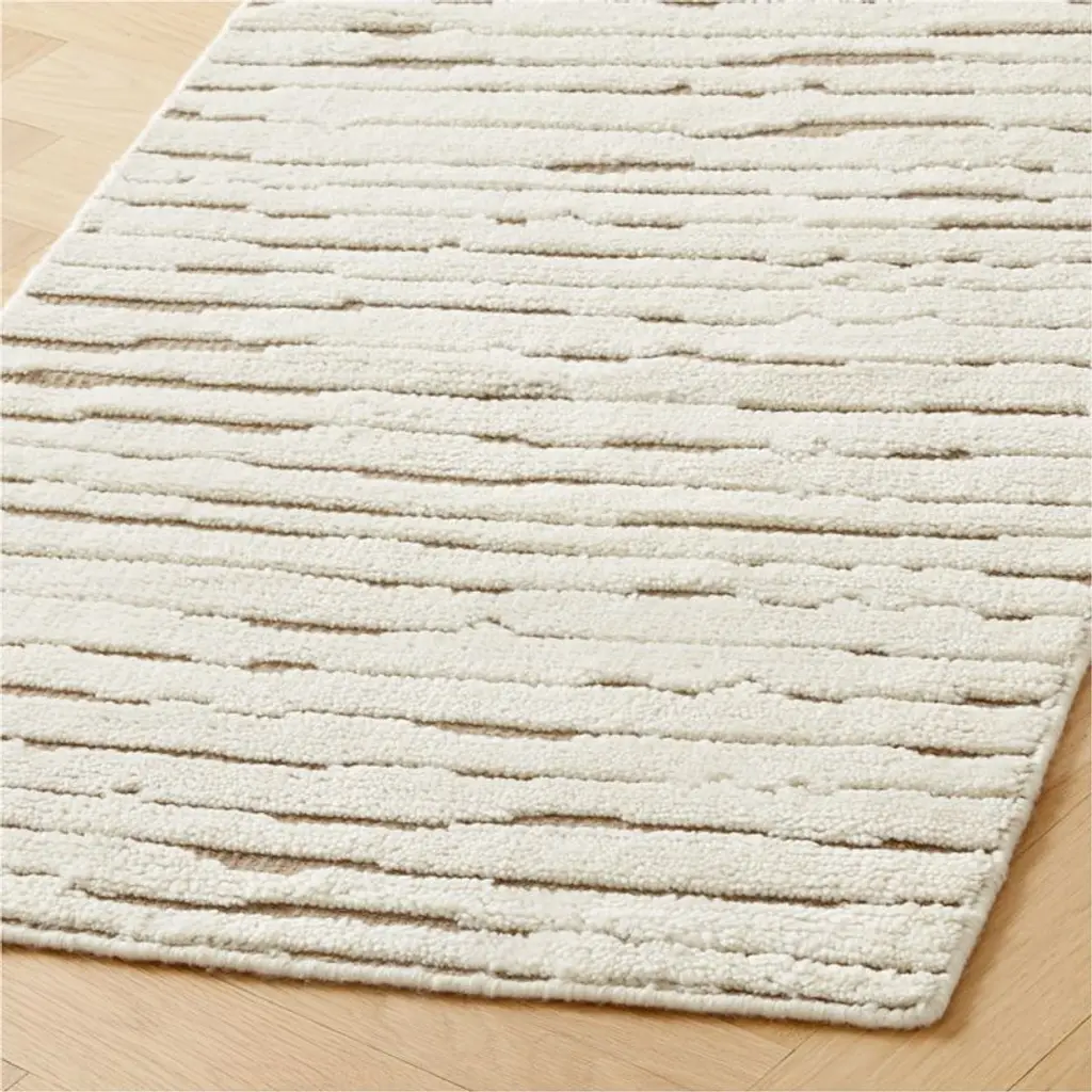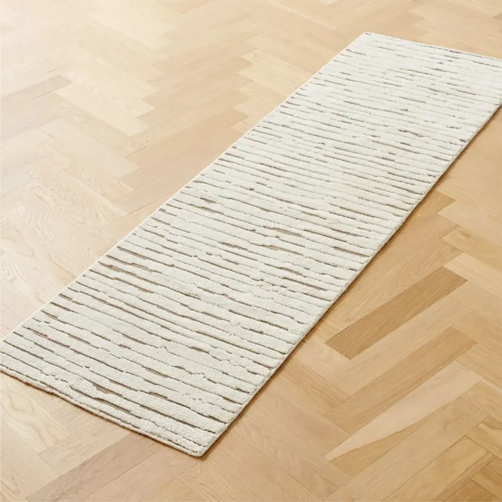 Ivory wool ripples across this high-contrast runner rug, creating a unique foundation for any room. New Zealand wool is dyed and hand-knotted with 16-18 knots per square inch for a super-soft, durable weave that holds up in medium- to high-traffic areas. The abstract geometric pattern by the Portland-based illustrators at Laundry Studio adds a bit of interest in tonal neutrals. CB2 exclusive.How will it look in your room? 12"x12" rug samples are available in stores for a fee refundable upon return of the sample.