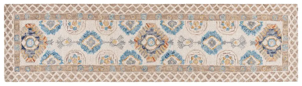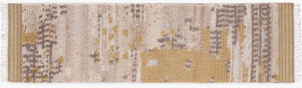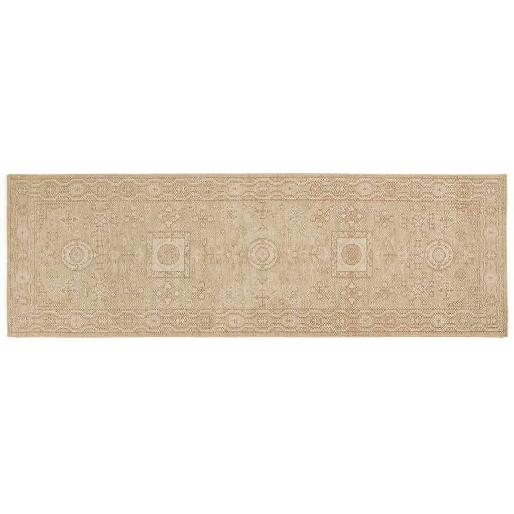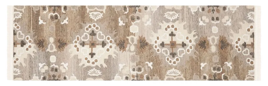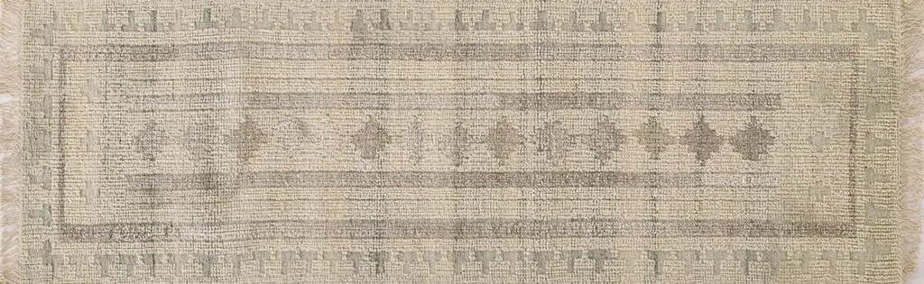 A blend of wool yarns, handwoven by expert artisans in India, is dyed in beautiful earth tones and meticulously incorporated into a traditional Dhurrie design. Known to be very sturdy and versatile, Dhurries are tightly woven by hand on traditional looms.