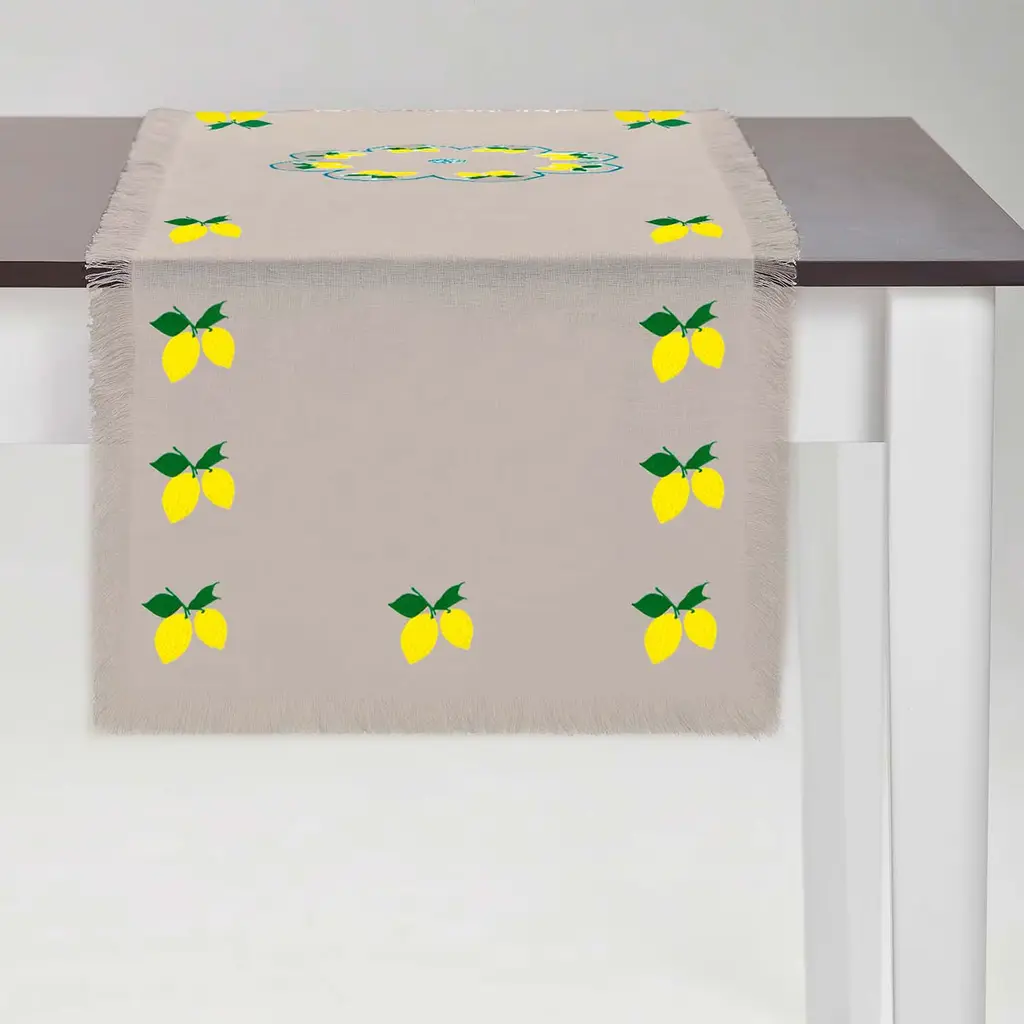 Sewn from extra-thin Masters of Linen-certified linen, this exclusive runner is an ode to manual embroidery mastery. Fringes enliven the sides, while a superb motif of lemons embroidered in Fien Mako cotton vibrantly emerges from the elegant taupe weft. Lively and refined, it is also available in multiple color options available in the Artemest catalog.