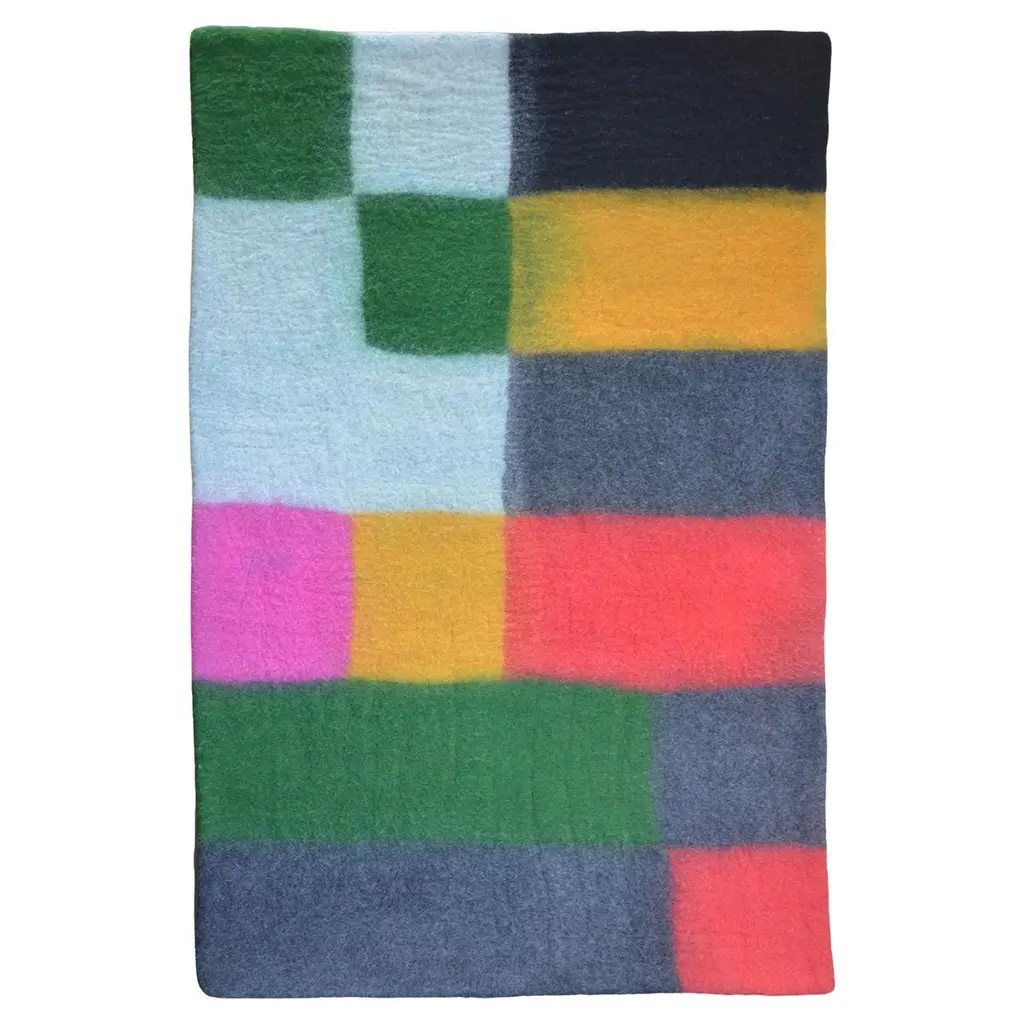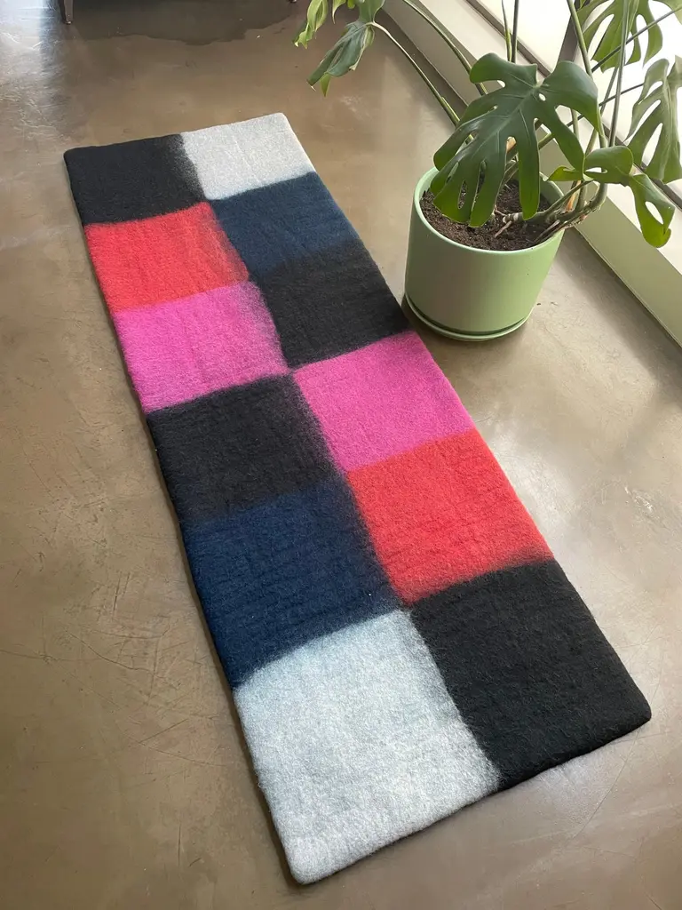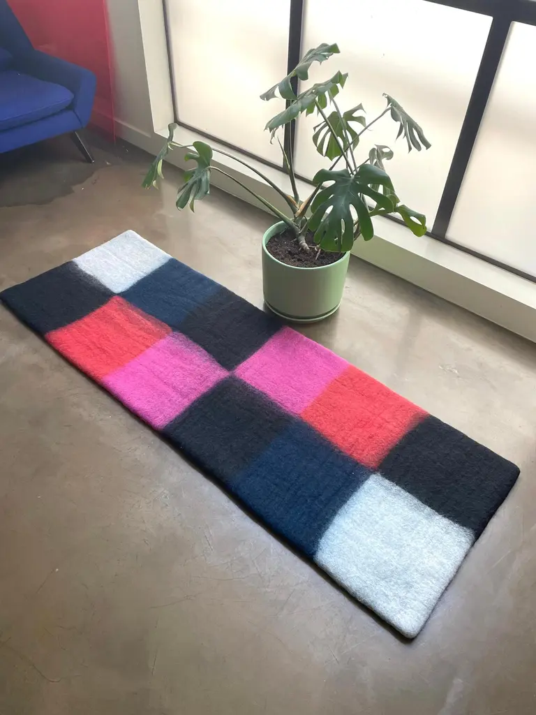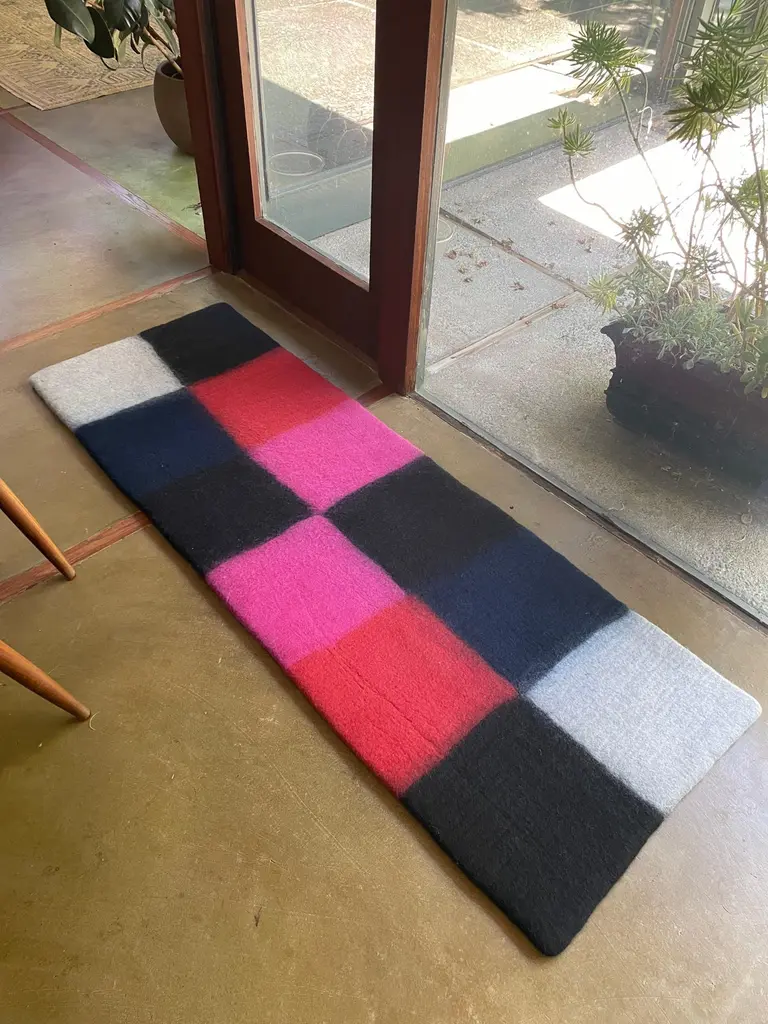 This rug is extremely unique. The history of wool felt rugs began with nomadic tribes in the Central Asian Steppes. I have been producing and designing this extremely rare form of rug making since 2002 in Iran, Turkey and now, Nepal. The price is very fair considering the rarity of contemporary hand felted rugs. For those unfamiliar with my unique felt rug collections, the experience is very unusual. The 3/4" felt is soft and thick and it feels incredibly luxurious to walk on. No rug pad is required. There is no backing to the rug. The back is a solid charcoal tone that can also be used as a second side. My boutique rug practice is well known in the Bay Area where I have operated several storefronts since 2002. The current location is in Oakland. My felt rugs are so easy to clean. They are flat which means a good sweep is all you need. Spot cleaning the stain resistant wool felt keeps the rug looking like new.