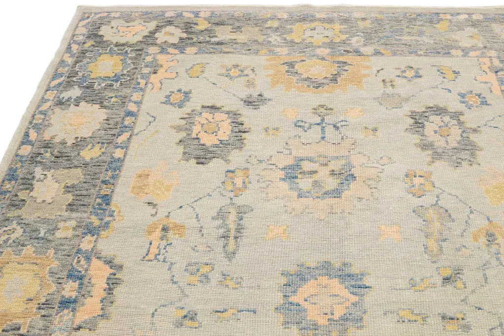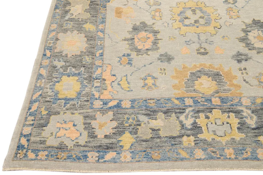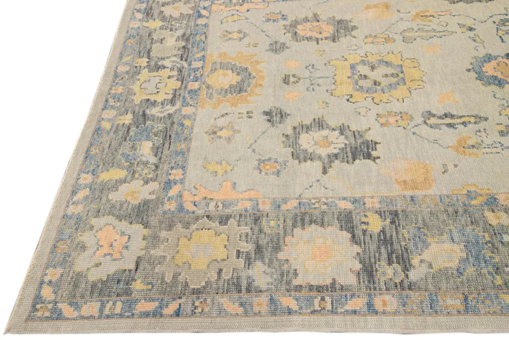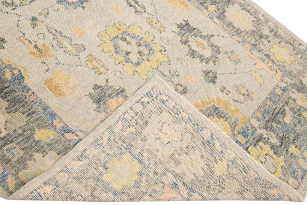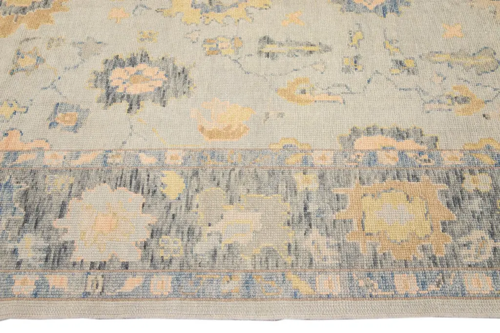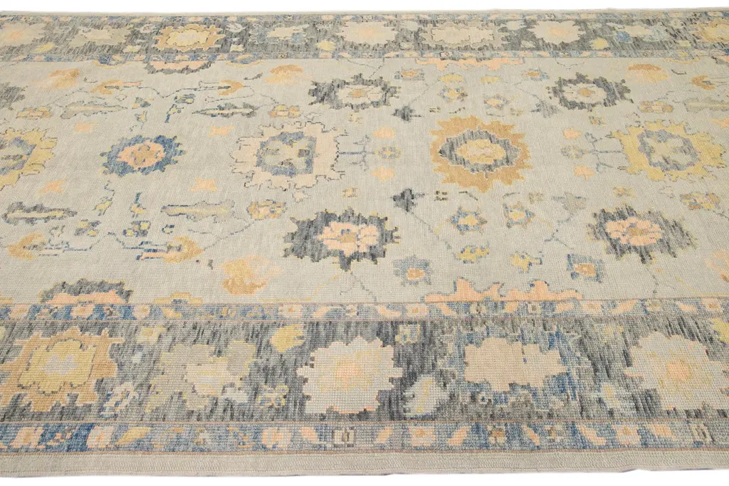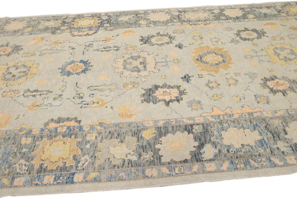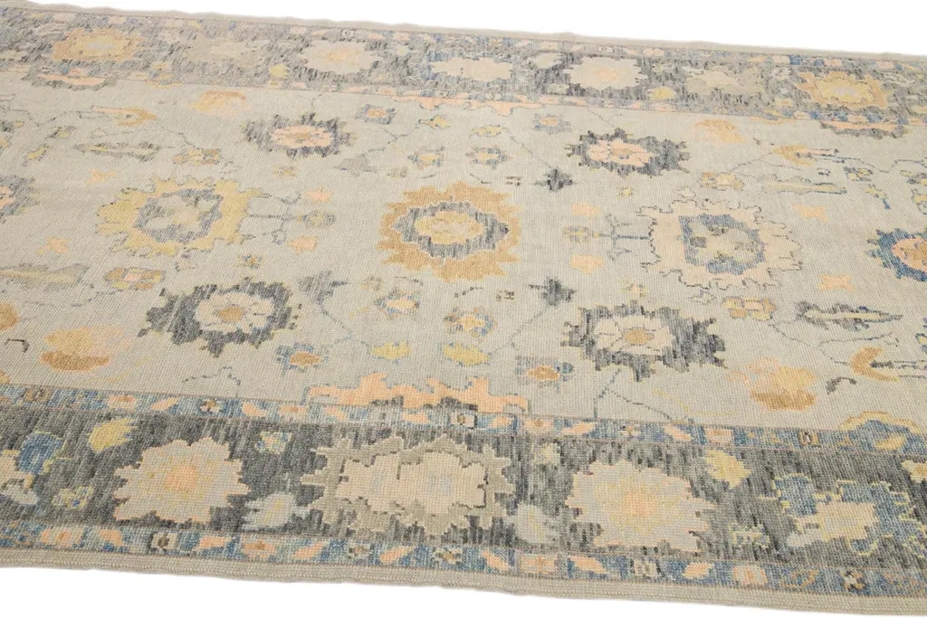 Beautiful modern Oushak hand-knotted Wide wool runner with a gray field. This Oushak rug has multicolor accents all over a gorgeous geometric floral motif.This rug measures 6'3" x 19'5".Our rugs are professional cleaning before shipping.