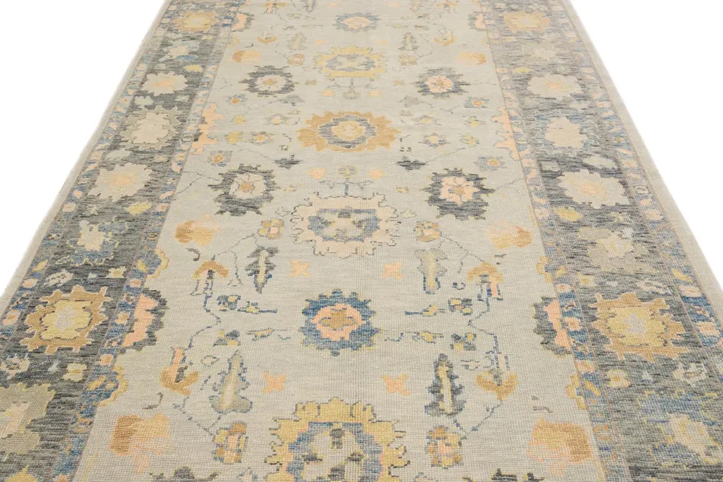 Long Modern Gray Turkish Oushak Handmade Floral Gallery Wool Runner