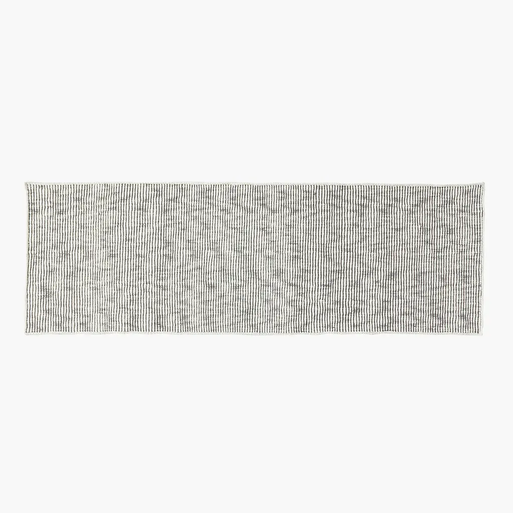 Handloomed runner rug is full of rich, natural texture and a super-soft feel underfoot. Plush loops of black and white yarn reveal a distinctive, chunky weave that offers a high-contrast foundation to any modern space. CB2 exclusive. How will it look in your room? 12"x12" rug samples are available in stores for a fee refundable upon return of the sample.