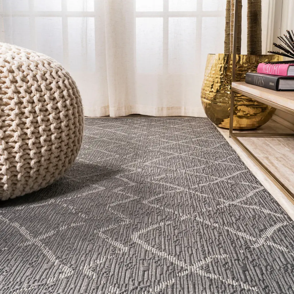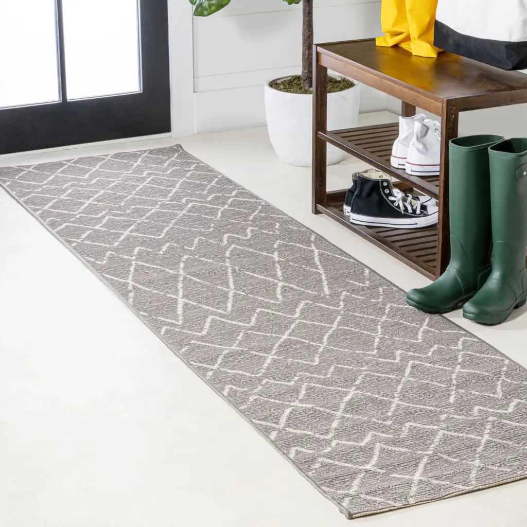 Inspired by vintage Moroccan rugs, our indoor/outdoor rug adds modern Bohemian style to your porch, patio or sunroom. The classic Moroccan pattern has a geometric design of beige diamonds on a field of dark gray. Mingled threads give this rug a handwoven, vintage vibe that''s perfect for an entry, kitchen, hallway, living room or bedroom too. The pet-friendly and kid-proof flatweave design makes it easy to clean, and perfect for the beach house.Features:• Power loomed with a flat pile that''s soft and durable• Woven shades of light gray and beige on a deep gray background• Made from easy-care polypropylene - just sweep, vacuum or hose down with mild soap and water• 100% Polypropylene• No backing, use of rug pad is recommended (sold separately)• Power Loomed in Turkey• Actual Dimension: 2 ft. 2 in. X 10 ft.• Color: Gray/Cream• Thickness measures: 0.19 in.• Available in multiple sizes and/or colorsRug Care:• Vacuum regularly and spot clean as needed; avoid direct and continuous exposure to sunlight; use brushless vacuum; remove spills immediately; if liquid, blot with clean, undyed cloth by pressing firmly around the spill to absorb as much as possible; for hard to remove stains, professional rug cleaning is recommended; store in a dry, well ventilated area and rotate for consistent wear• Packing and shipping may cause temporary creases in rugs, which will flatten out after a week on the floor; to expedite the process, try back-rolling your rug before laying it down, and then allow ample time for the remaining creases to relax• Please Note: Due to differences in monitors, some rug colors may vary slightly. Lengths and widths may vary from the published dimensions. Patterns may vary slightly according to shape and size selected.About us:Style your floors with JONATHAN Y. By combining fine craftsmanship and design, this New York creative studio is bringing fashion to your floors. The collection mixes sustainable organic materials, vibrant colors and trend worthy styles to create JONATHAN Y''s distinctive catalog of rugs.