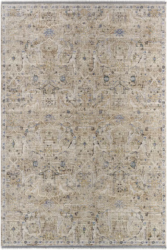 Collection: Margo Colors: Medium Gray Construction: Machine Woven Material: 100% Polyester Pile: Medium Pile Pile Height: 0.35" Styles: Traditional Made In: Turkey Thickness: 0.55" Fringe Length: 0.59" Price Range: $$$$$ (Affordable)