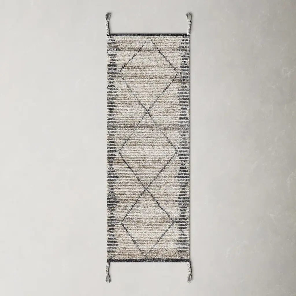 The Milan Runner Rug from Alder & Ore (Safavieh) showcases intricate hand-knotted patterns that evolve along its length. The wool construction creates a crisp definition in its geometric designs, while decorative tassels add movement at each end. Made in India, the runner combines repeating diamond motifs with precise linear elements. The pattern transitions smoothly between different design zones, creating natural pause points along its length. End tassels complete the artisanal look.