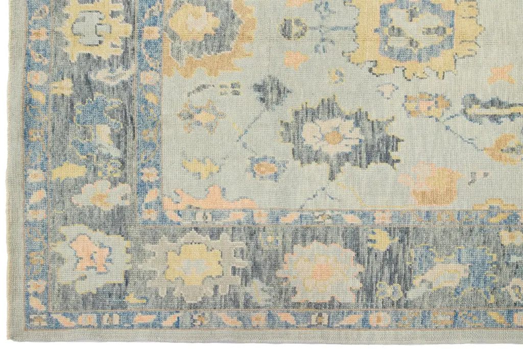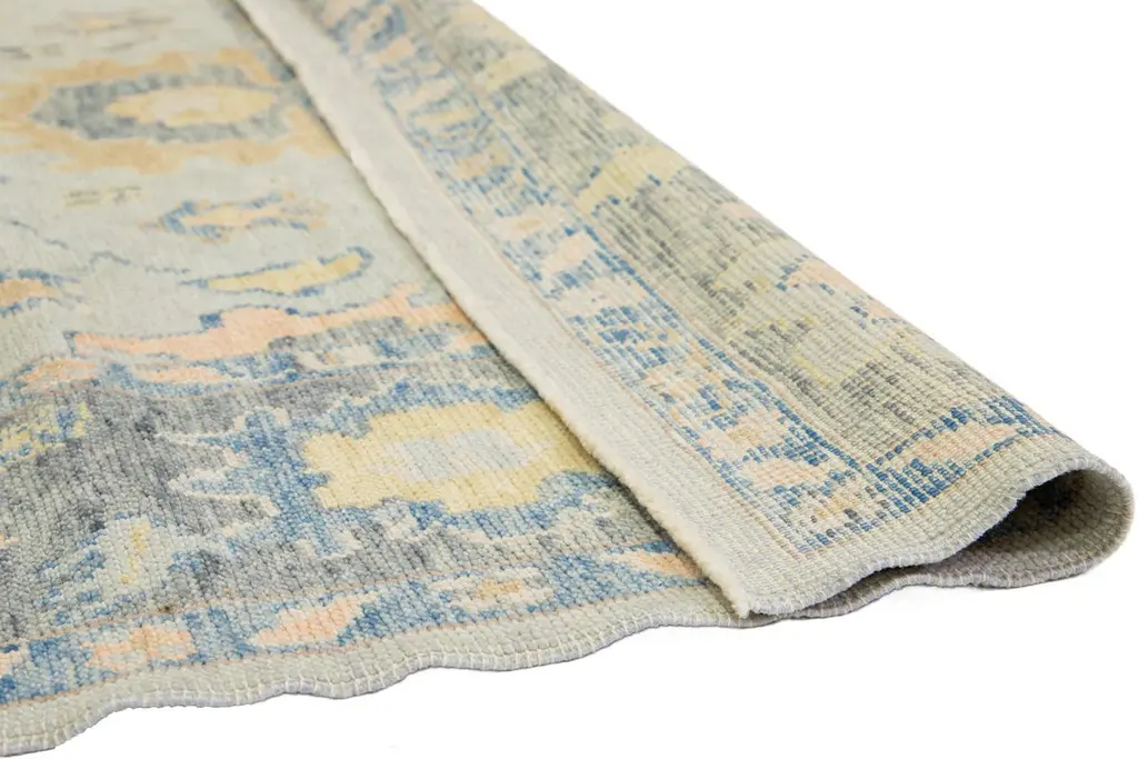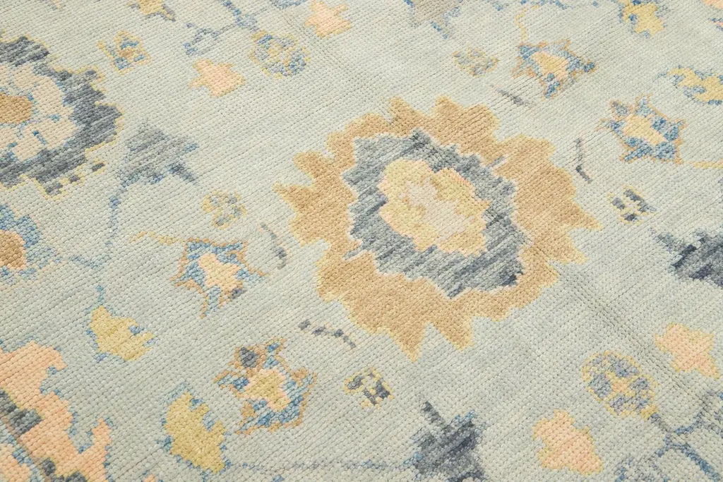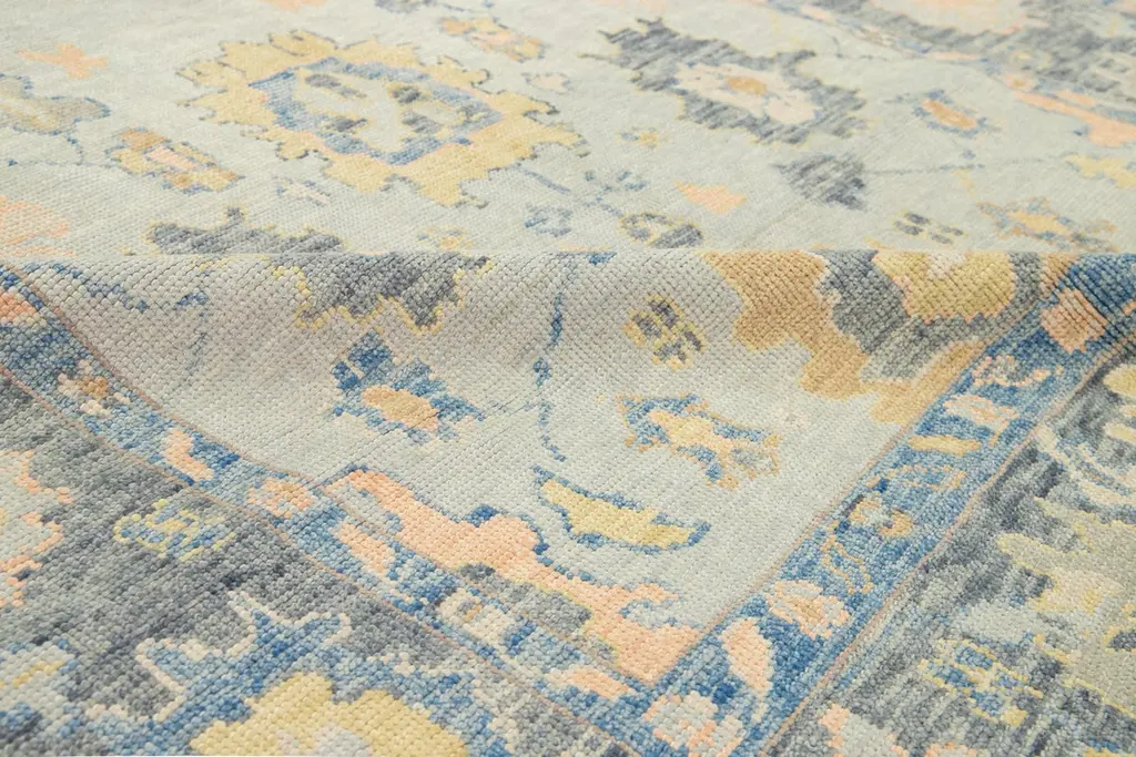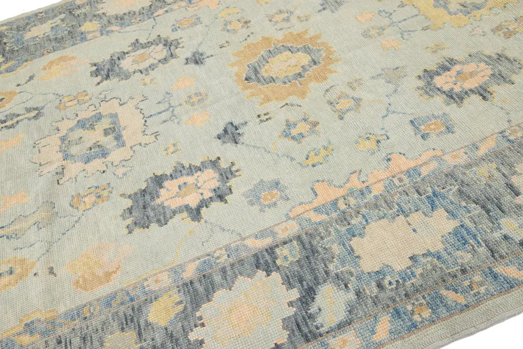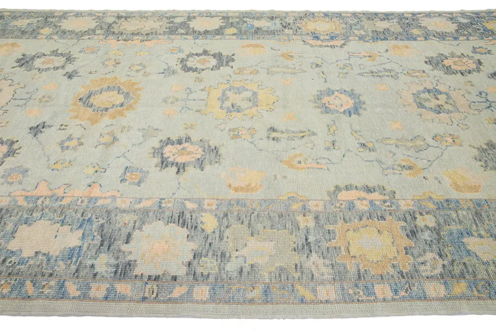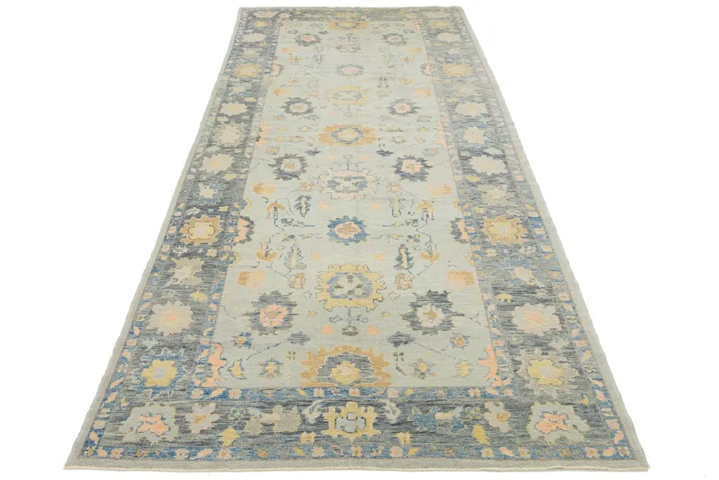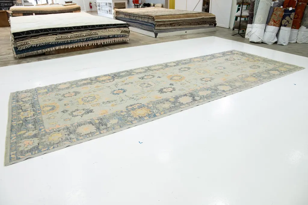 Beautiful modern Oushak hand-knotted wide wool rug with a gray field. This Oushak rug has multicolor accents all over a gorgeous geometric floral motif.This rug measures 6'3" x 17'5".Our rugs are professional cleaning before shipping.