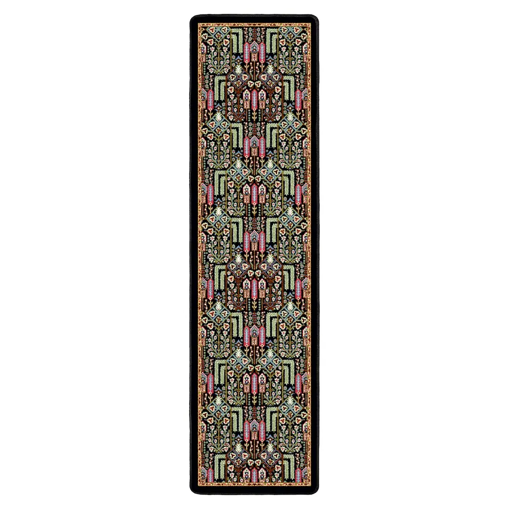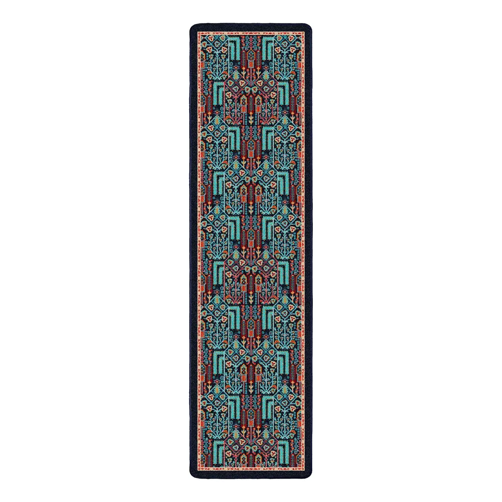 This folk art style Mount Joy EnduraStran Area Rug features jewel tones that pop against a black background. It’s the perfect blend of elegance and durability, at home in any home from modern to traditional. Made of commercial-grade EnduraStran, this area rug is fade-, fire- and stain-resistant, perfect for homes with kids, pets and lots of foot traffic. No worries about muddy paws or spills; rug is anti-microbial and cleans easily with just water! Lok-Bak™ technology ensures that the rug lays flat; won’t bunch or buckle. Serged edges offer maximum durability. Use with a rug pad. Design varies slightly by size. Sizes are approximate. Pile is approx. 1"H. Easy care, spot clean with water. Made in USA.