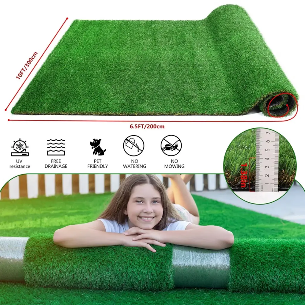 NAYSAYE rug artificial grass runner delivers a soft realistic surface for indoor and outdoor spaces. The durable synthetic fibers resist water UV and frost while offering long lasting wear. Grooves and drainage holes in the backing keep the surface dry and easy to maintain. This low maintenance rug requires no mowing or watering and provides a vibrant natural look. It works well for patios yards balconies and home gyms while offering a comfortable area for pets exercise or play activities.