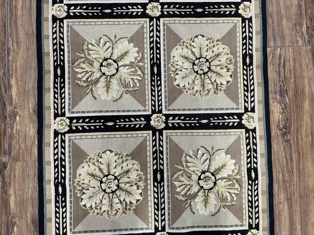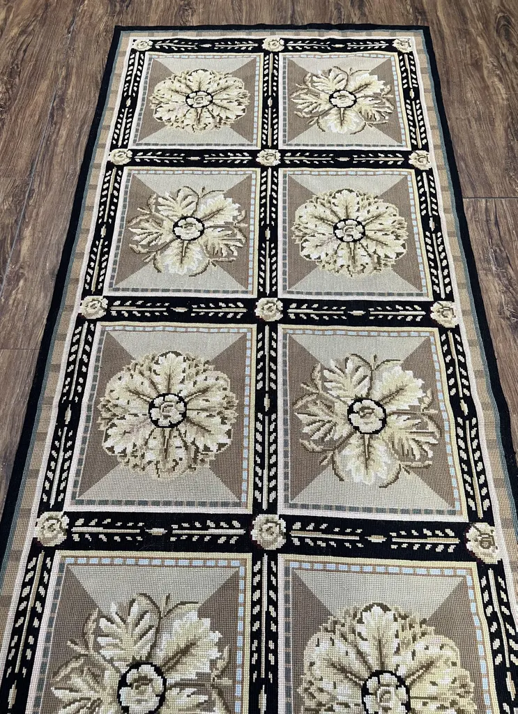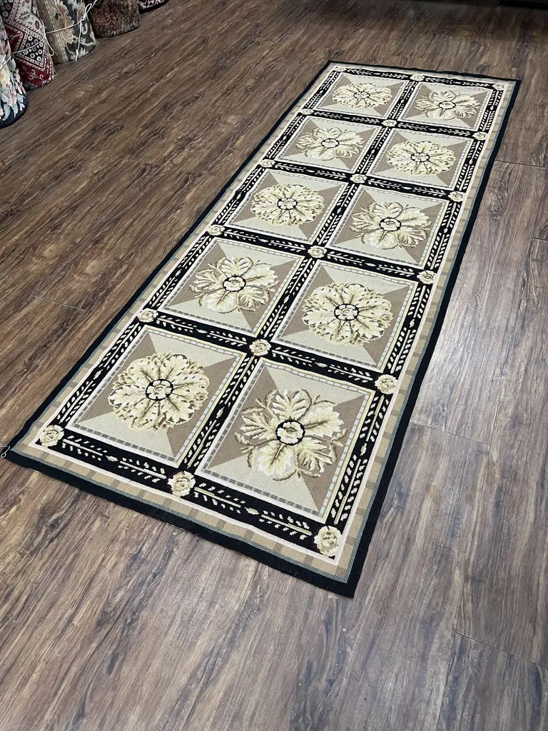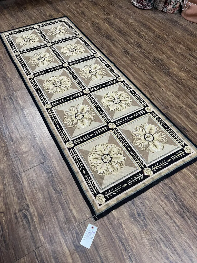 Needlepoint Runner Rug 3X8 Panel Design Rug, Flatweave Runner Rug, English Design, Floral, Short Runner Rug, Black And Beige Wool Hand-Woven - Default Title