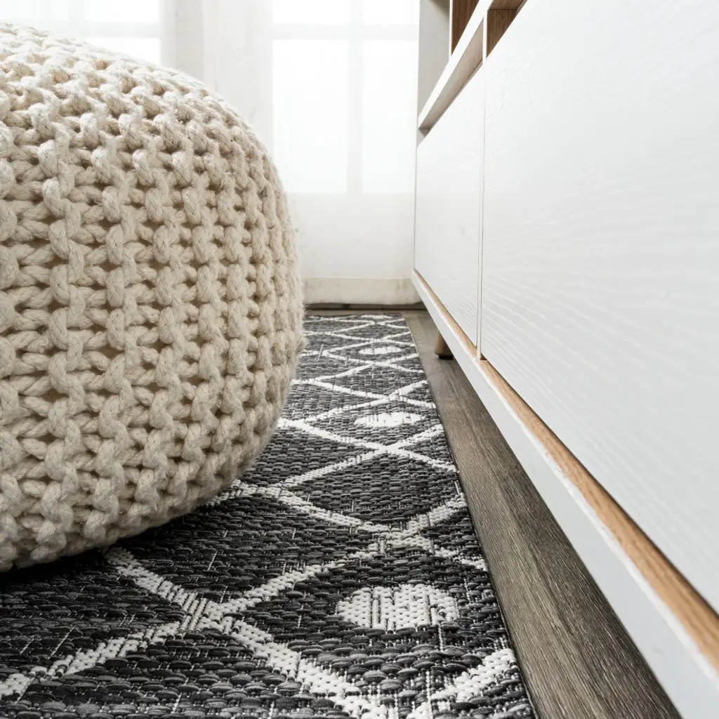 Moroccan influences abound in the geometric design of our tribal-inspired rug. The ornate diamond pattern has the handwoven look that adds a global chic touch. Add Bohemian flair to your living room, dining room, bedroom, kitchen or entry with this easy-care rug.Features:• Power loomed with a 0.19" pile that''s soft and durable• The soft black and ivory color scheme adds mid-century modern flair to this tribal design• Made from easy-care polypropylene - just sweep, vacuum or hose down with mild soap and water• 100% Polypropylene• No backing, use of rug pad is recommended (sold separately)• Power Loomed in Turkey• Actual Dimension: 2 ft. 2 in. x 8 ft.• Color: Black/Ivory• Thickness measures: 0.19 in.• Available in multiple sizes and/or colorsRug Care:• Vacuum regularly and spot clean as needed; avoid direct and continuous exposure to sunlight; use brushless vacuum; remove spills immediately; if liquid, blot with clean, undyed cloth by pressing firmly around the spill to absorb as much as possible; for hard to remove stains, professional rug cleaning is recommended; store in a dry, well ventilated area and rotate for consistent wear• Packing and shipping may cause temporary creases in rugs, which will flatten out after a week on the floor; to expedite the process, try back-rolling your rug before laying it down, and then allow ample time for the remaining creases to relax• Please Note: Due to differences in monitors, some rug colors may vary slightly. Lengths and widths may vary from the published dimensions. Patterns may vary slightly according to shape and size selected.