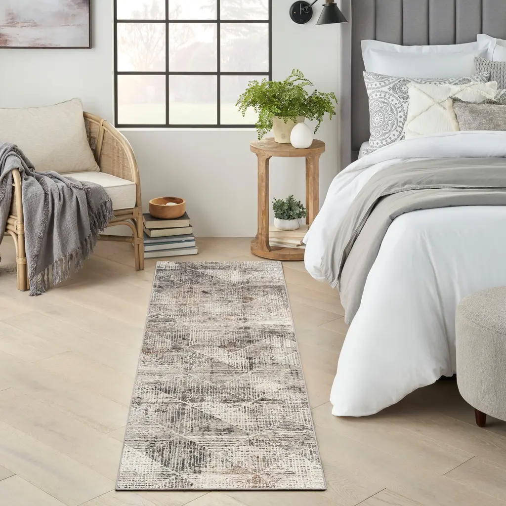 Bring chic, urban style to your space with this modern rug from the Eco-Friendly Collection. The abstract design, presented in shades of grey, ivory, and tan, is overlaid with a geometric pattern that adds a stunning pop of pattern. This abstract rug is sustainably crafted from recycled polyester fibers for a stylish, environmentally friendly way to decorate your living room, hallway, bedroom, or kitchen.