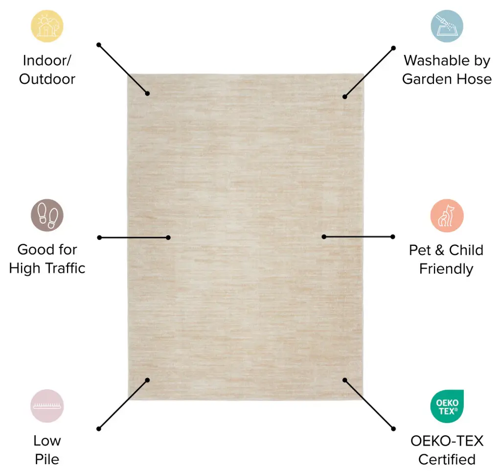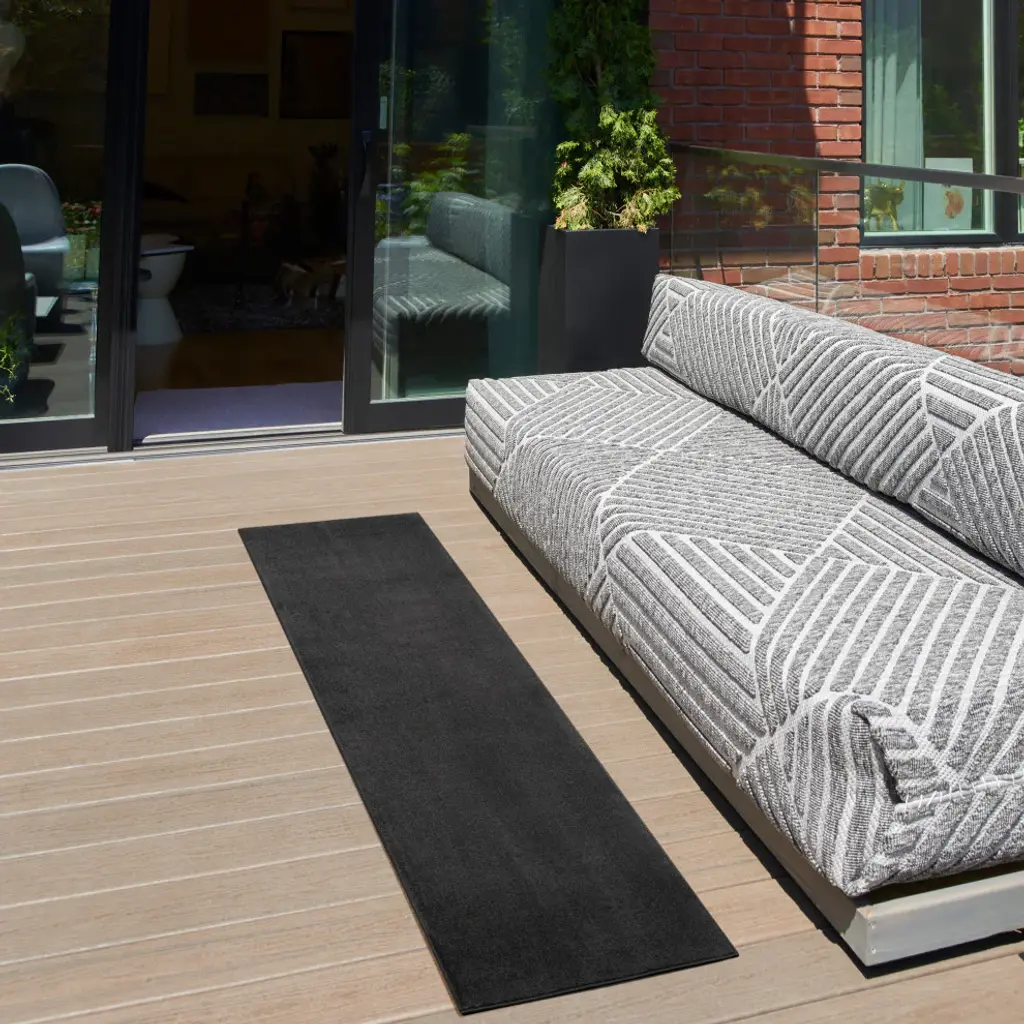 Designed for busy, active lifestyles, this black outdoor rug from the Nourison Essentials Collection is the ideal pairing of style and practicality. The simple, solid pattern is enhanced with subtle tonal variations and a surprisingly soft texture that�s equally suitable for any room inside the home. Place in any room as a standalone foundation for your d�cor or use as part of a layered rug look. Machine-made with a low-profile construction from easy to clean polypropylene yarns, this modern rug easily withstands heavy traffic and does not shed. Hand washable outdoors only: rinse with a hose and air dry.VERSATILE DESIGN: This outdoor rug has a soft texture that adds comfort to indoor and outdoor spaces alike.EASY TO CLEAN: Vacuum once a week when using indoors. Washable outdoors only using a garden hose; simply rinse and air dry fully.GREAT FOR LAYERING: The simple, solid design is great as a base for layering with your favorite patterned rugs.LOW PILE: This low-profile rug lays flat quickly for easy placement under furniture and near doorways.MULTIPLE SIZES AVAILABLE: Choose from a variety of shapes and sizes including runner rugs for the kitchen, large rugs for the living room and bedroom, and round rugs for unique spaces.To extend the life of your rug, bring indoors during extreme weather.OEKO-TEX Certified