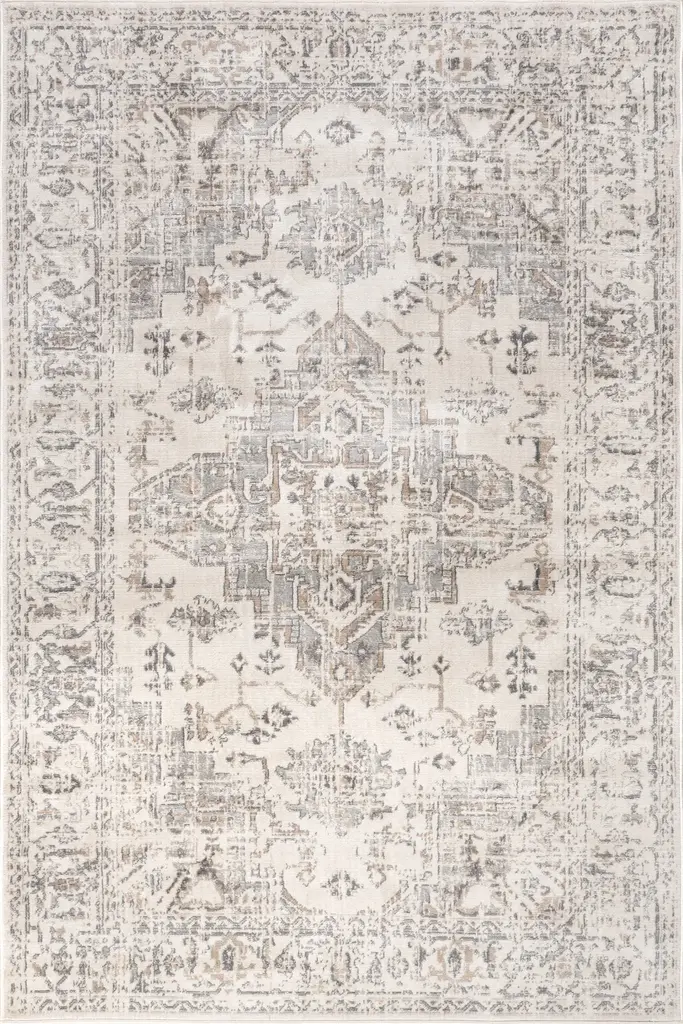Bring vintage-inspired flair to your space with this boho rug from the Nyle Collection. With its ivory and taupe color palette and abrash finish, the traditional Persian floral medallion pattern channels the look of an heirloom rug. Machine-made from softly textured, easy-clean fibers with metallic serged edges, fringe at both ends, and subtle high-low accents. Runners do not include the fringe.