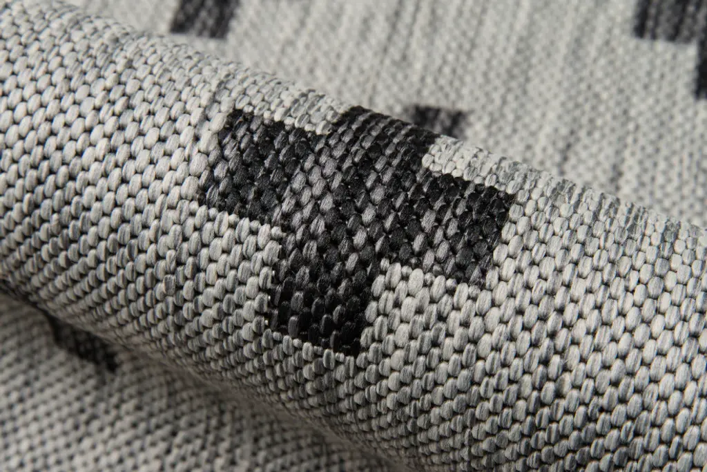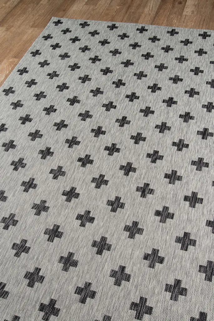 All-weather textiles get the graphic treatment in the all-over pattern of this indoor/outdoor area rug. The geometric print is a striking repeat of black crosses that cover the grey background in shapes that recall the Romanesque cutouts of classical Italian architecture. Resilient polypropylene fibers are stain, heat and UV-resistant, retaining their color and texture throughout consistent exposure to the elements.