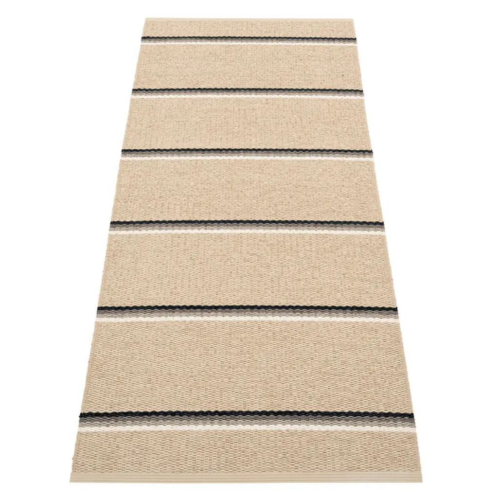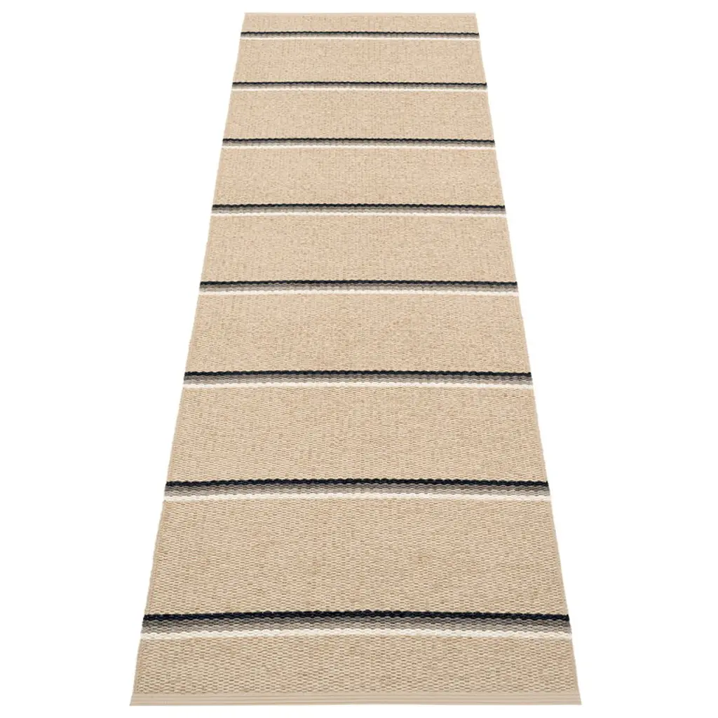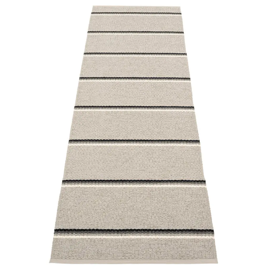 Pappelina’s Olle rug features an earthy background color with a stripe pattern woven in several different hues. The double-folded edges are hemmed for strength and durability. Made of phthalate-free PVC ribbon, the rug is very easy to clean, making it a practical choice for all spaces from the kids' room to the kitchen. Due to its narrow form, the rug is also an ideal hallway runner, and it can even be used outdoors on the balcony, veranda or patio. Made in Dalarna, Sweden, the rug has been woven using traditional techniques and it is available in several colourways.