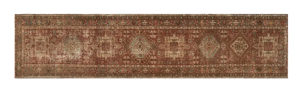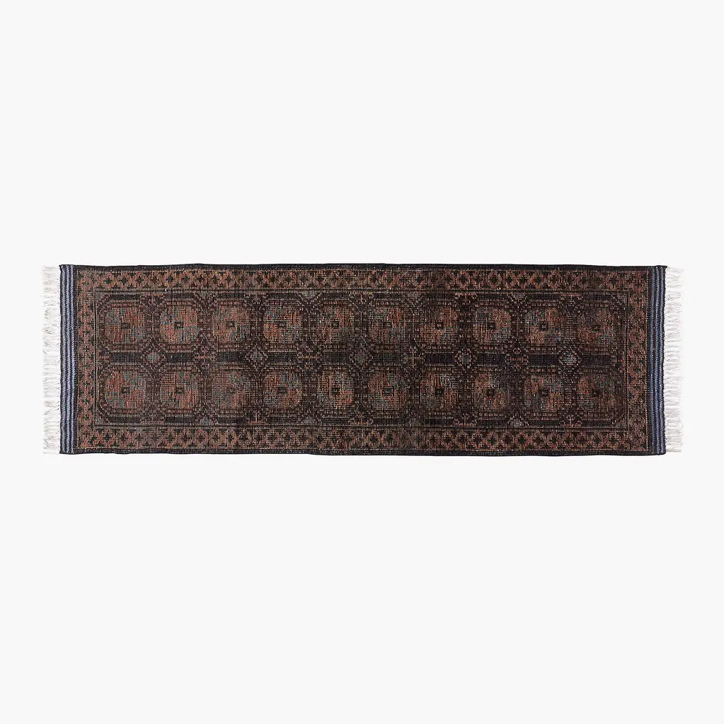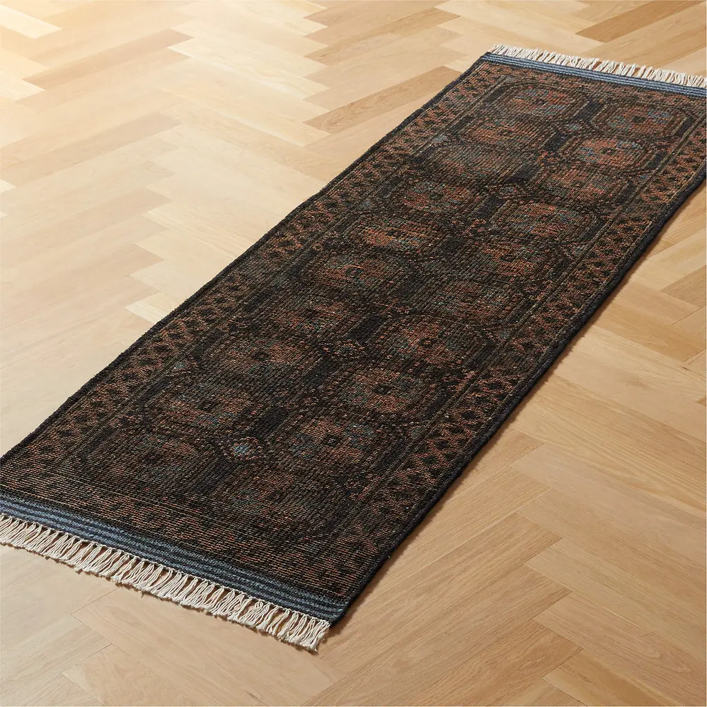 Hand-knotted in India with 18–19 knots per square inch, pure New Zealand wool is sculpted into an intricately detailed design. Distressed by hand for an aged appeal, each runner has its own unique variations in tone. CB2 exclusive. How will it look in your room? 12"x12" rug samples are available in stores for a fee refundable upon return of the sample.