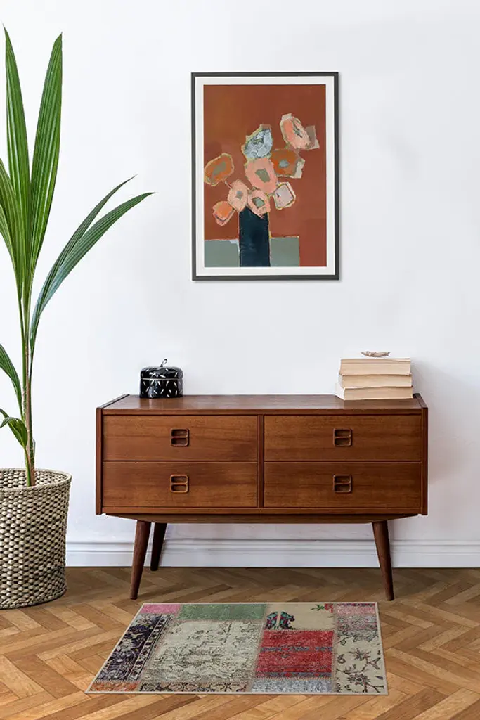 Our beautiful Patchwork Boho Rug is a one-of-a-kind design that will instantly add character to any space in your home. Its mixed-floral patchwork motif includes an array of rich and vibrant hues of rose, taupe, sky blue, ivory, green, and orange. Whether as an area rug or runner, this head-turning piece will add drama to any modern, bohemian, or shabby chic interior.
