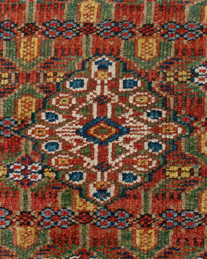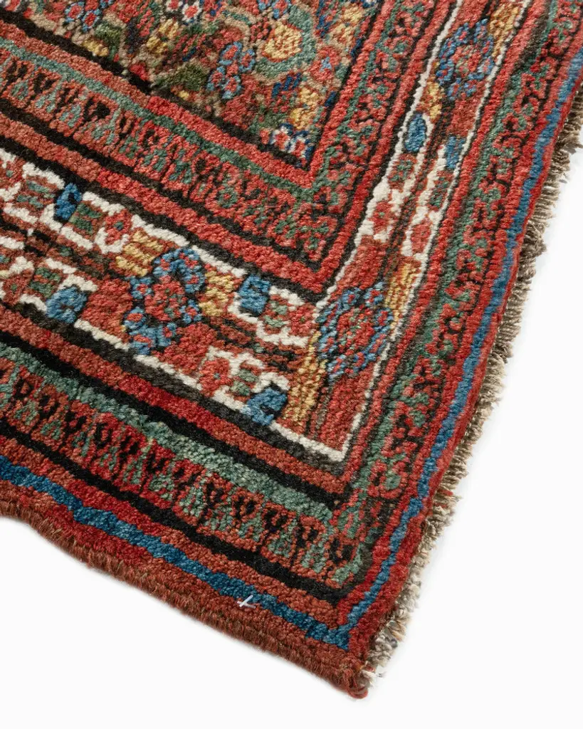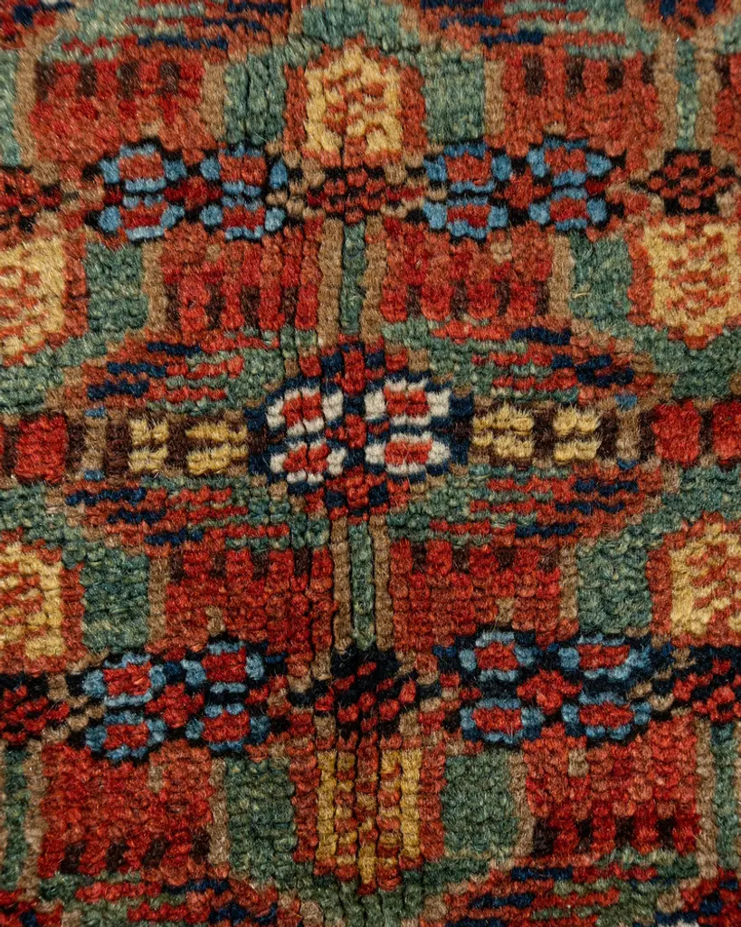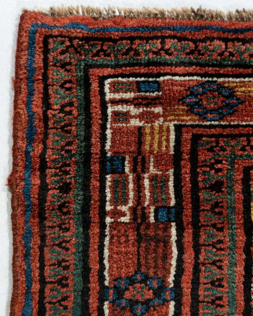 A wonderful antique Serab gallery-runner rug with the date in Persian 1916 woven into rug, in a hard to find size. Serab is located on the edge of the Heriz weaving area and specializes in runners. The patterns are geometric, the wool pile is quite dense and more modern rugs tend toward lighter palettes. Few scatters and no room size antique Serab�����s were woven. Colors: brick/green/ivory/gold/black.