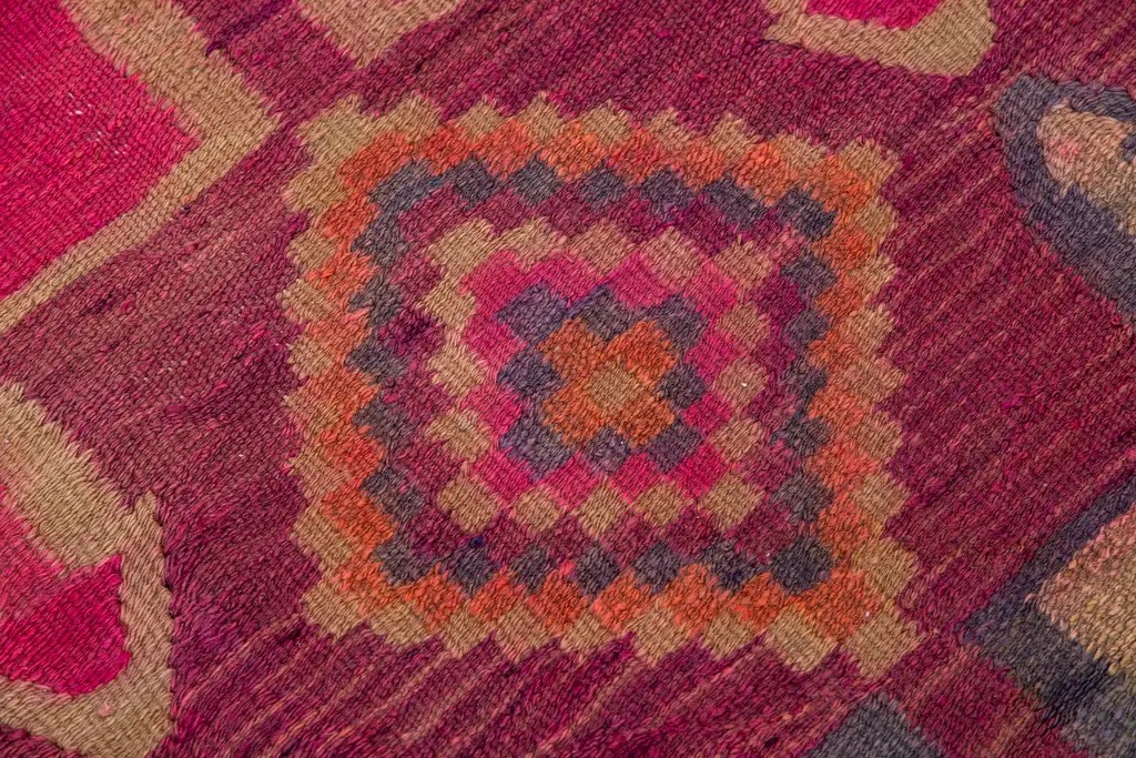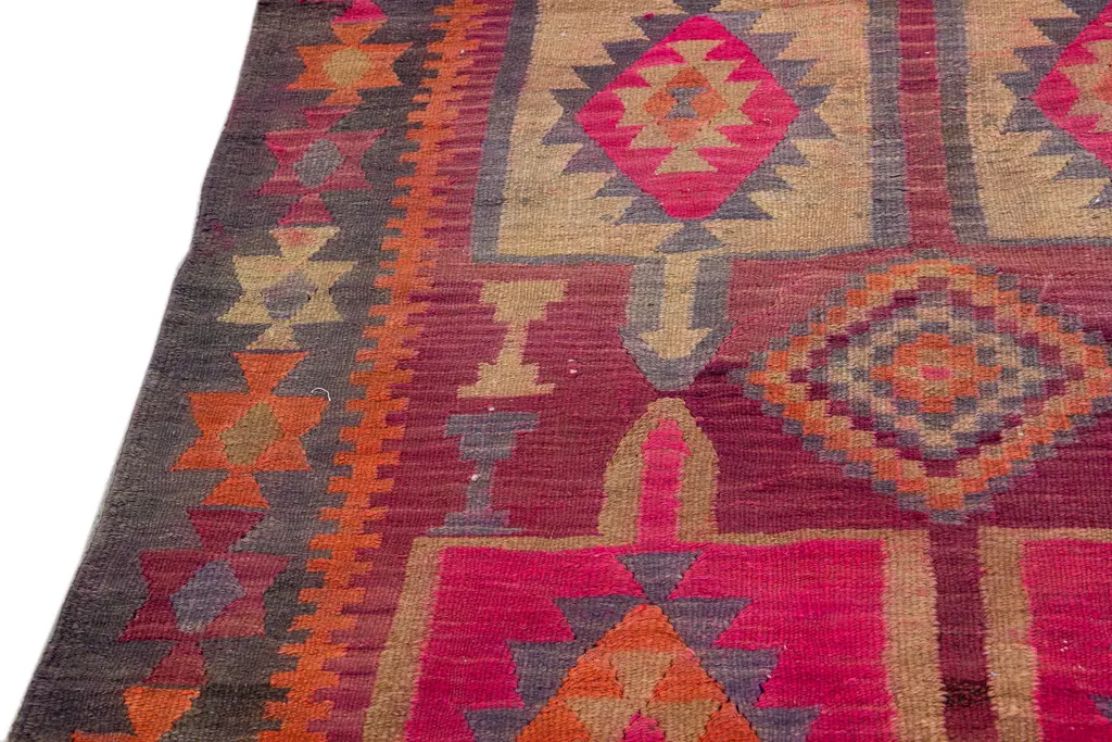 Beautiful kilim handmade wool runner with a pink field. This Vintage flatweave rug has orange, gray, and brown accents feature a gorgeous all-over tribal design. This rug measures: 4'8" x 11'7"