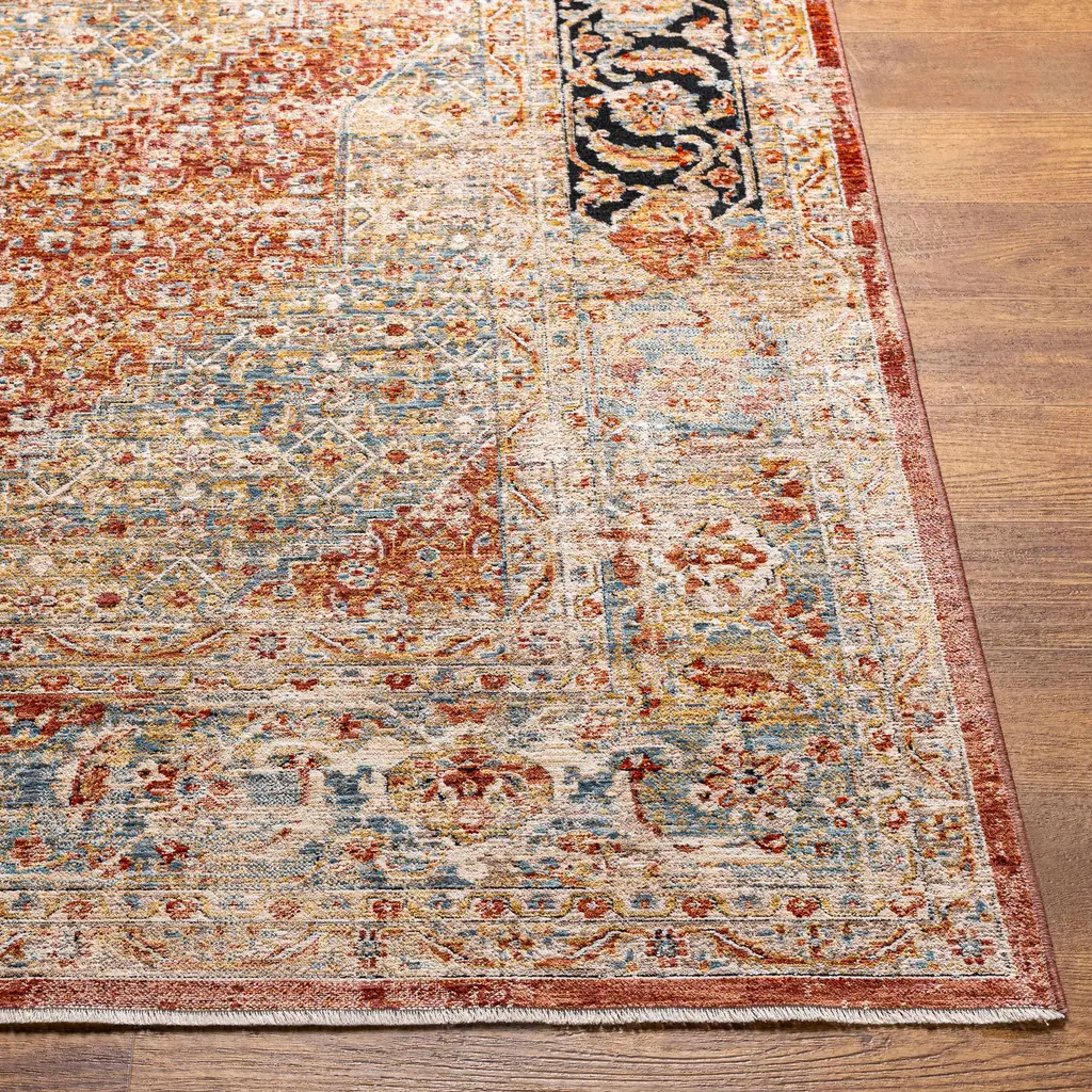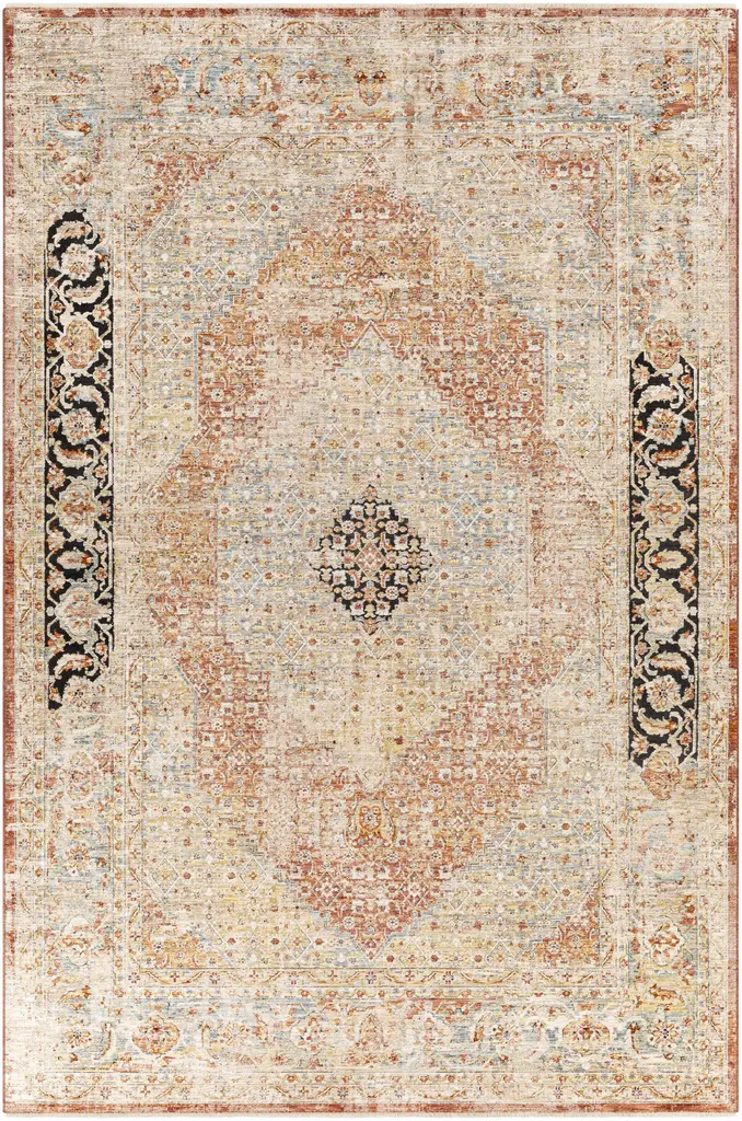 Collection: Polomolok Colors: Black, Burgundy, Dusty Pink, Ice Blue, Rust Construction: Machine Woven Material: 100% Polyester Pile: Low Pile Pile Height: 0.12" Styles: Traditional Backing: Canvas Made In: Turkey Thickness: 0.16" Fringe Length: 0.6" Price Range: $$$$$ (Most Affordable)