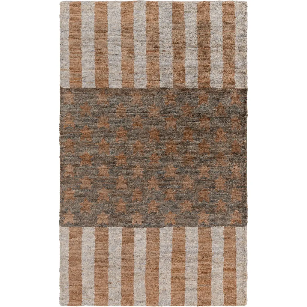 Collection: Randleman Colors: Gray, Slate Blue, Green, Dark Red Construction: Hand Knotted Material: 100% Jute Pile: Low Pile Pile Height: 0.11" Styles: Natural Fibers Made In: India Thickness: 0.24" Price Range: $$$$$ (Affordable)