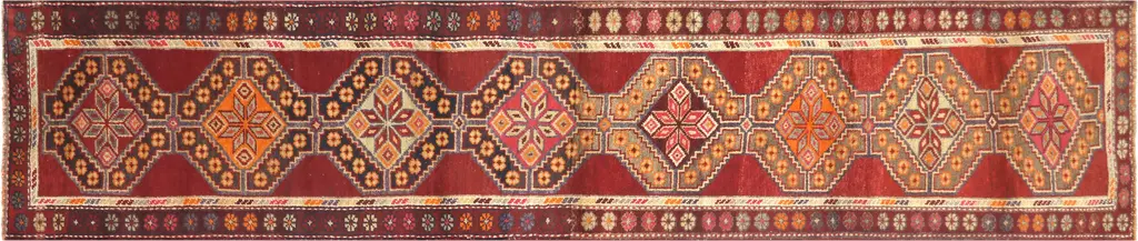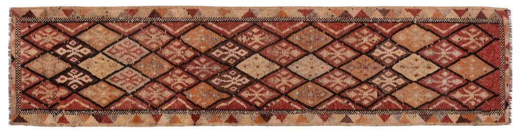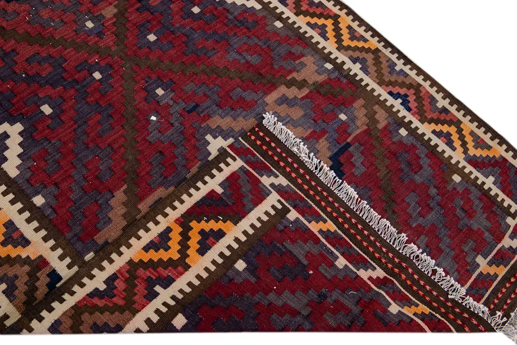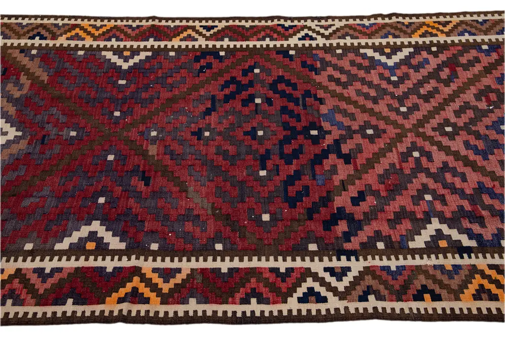 Beautiful kilim handmade wool runner with a red field. This Vintage flatweave rug has orange, blue, and brown accents feature a gorgeous all-over geometric design. This rug measures: 3'11" x 9'9"
