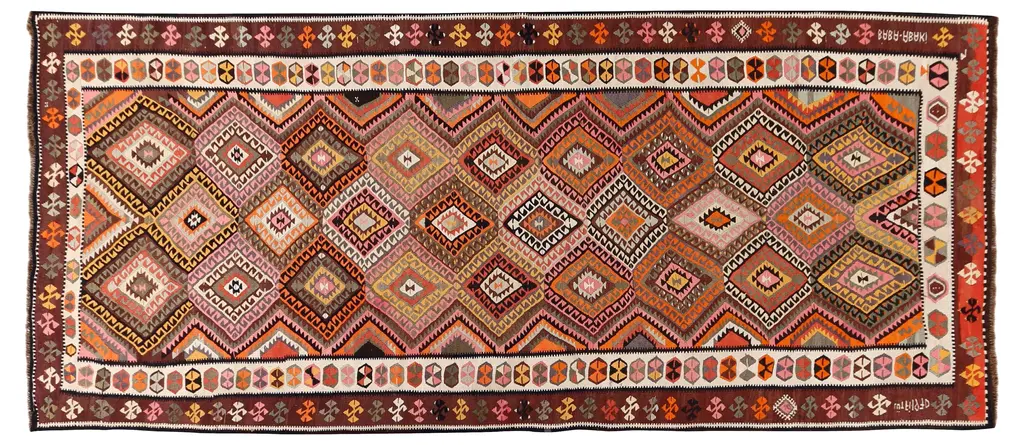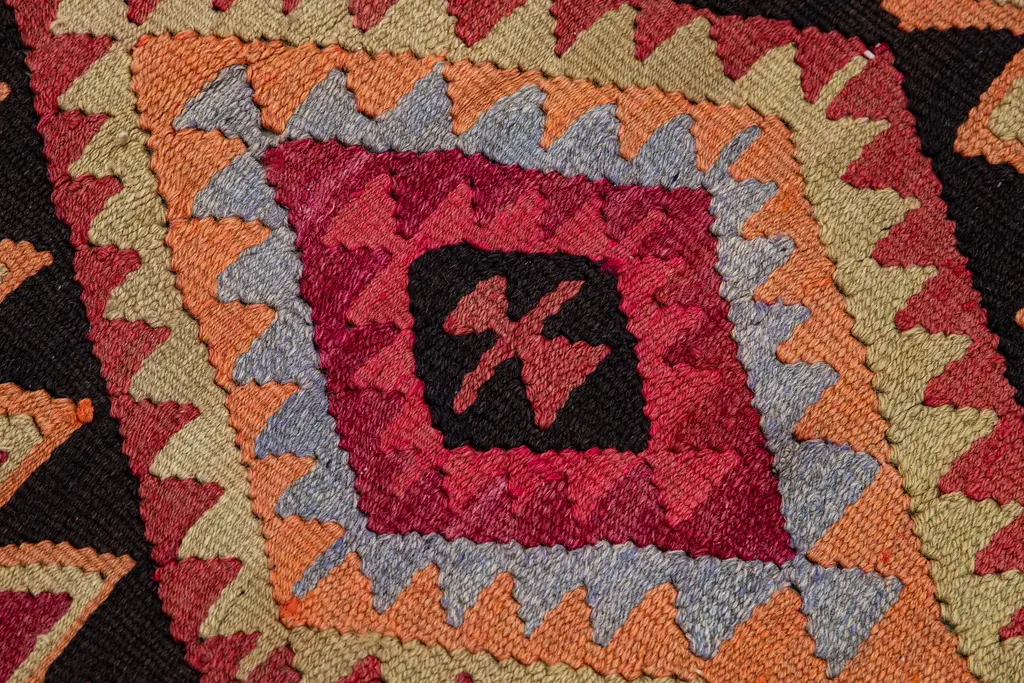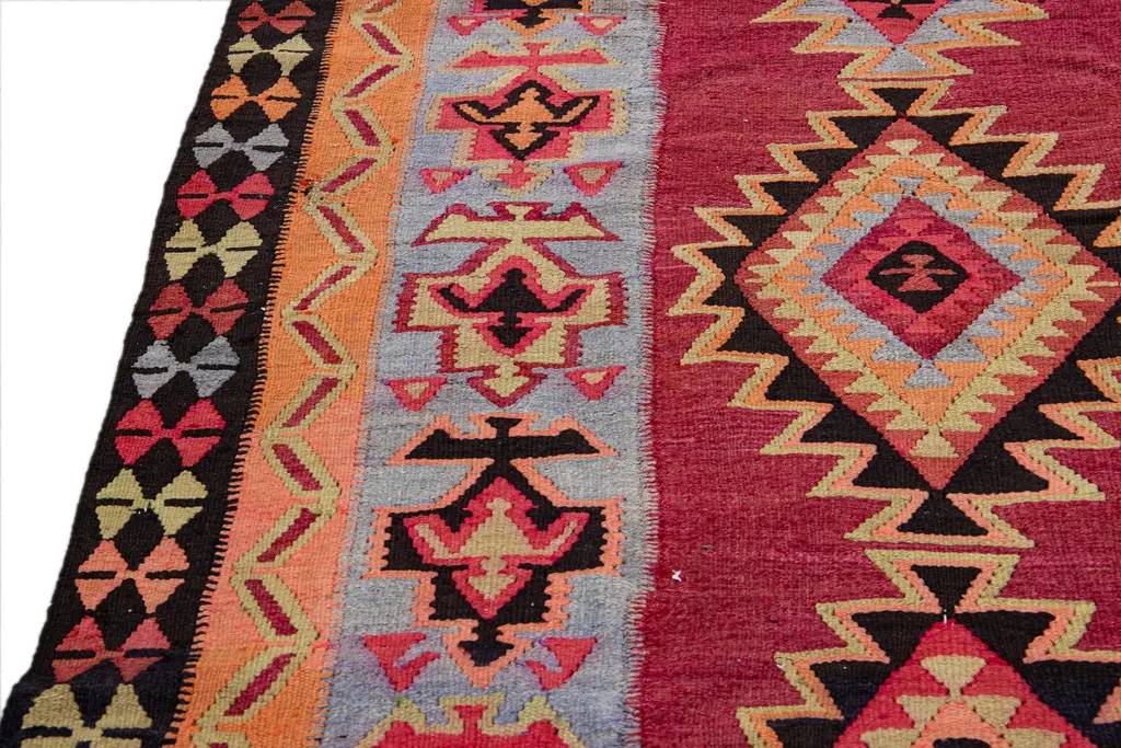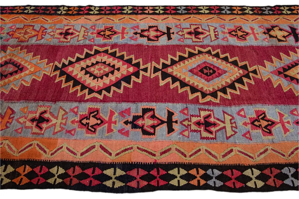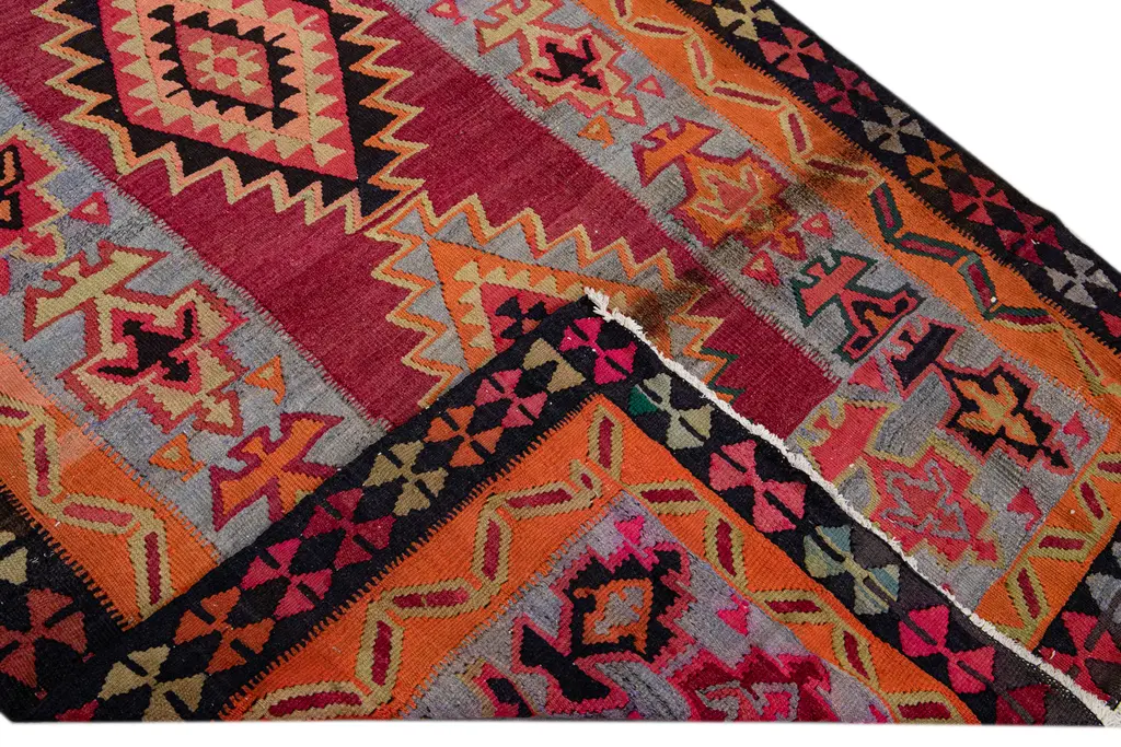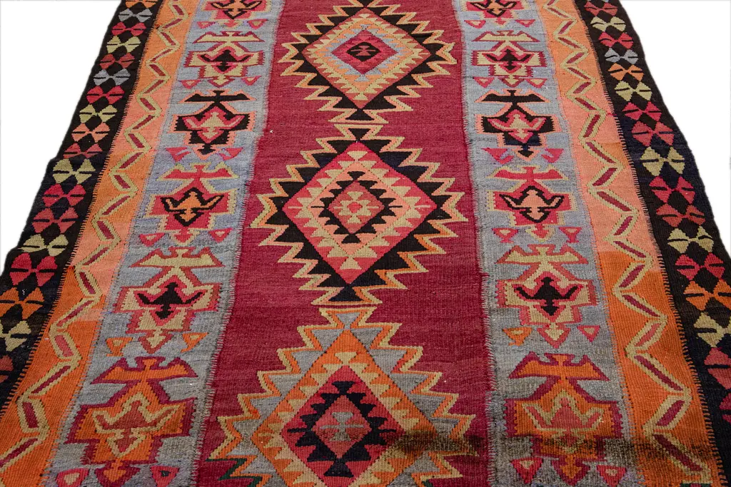 Beautiful kilim handmade wool runner with a red field. This Vintage flatweave rug has orange, gray, and tan accents feature a gorgeous all-over tribal design. This rug measures: 5'2" x 12'1"